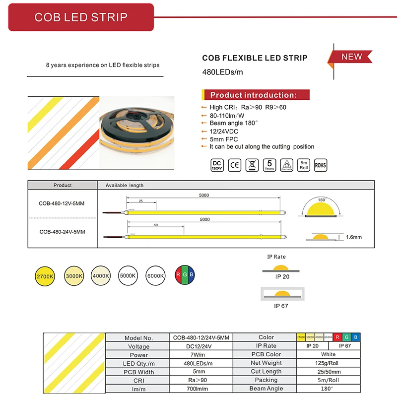 5 мм супер тонкий COB светодиодный ленточный светильник 480 светодиодов DC12V 24V с регулируемой яркостью красный зеленый синий 2700K 3000K 4000K 6000K гибкая светодиодная лента