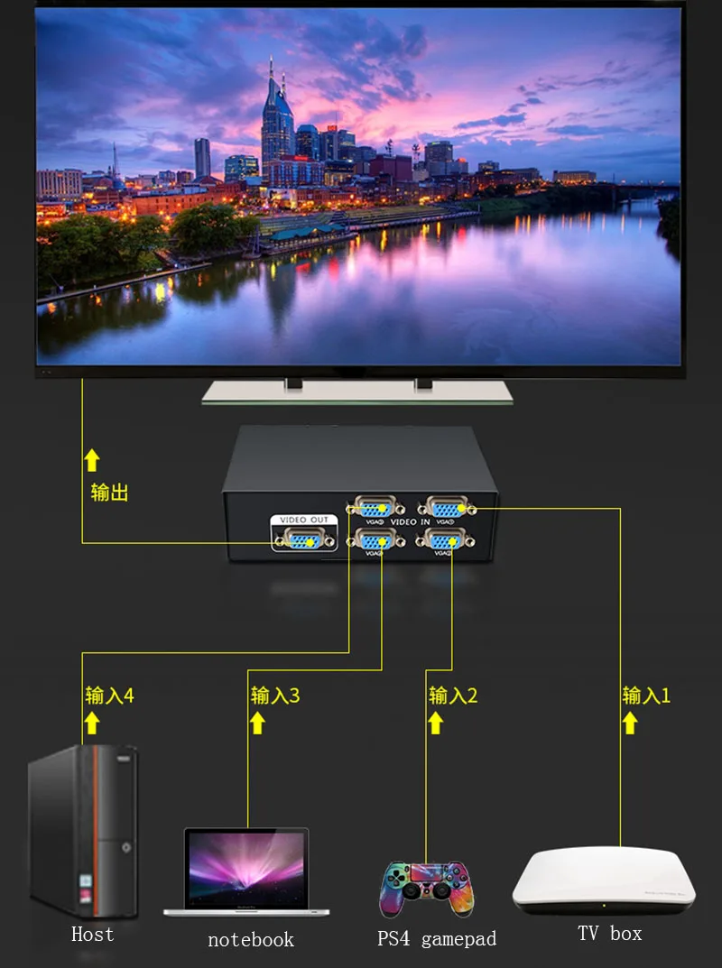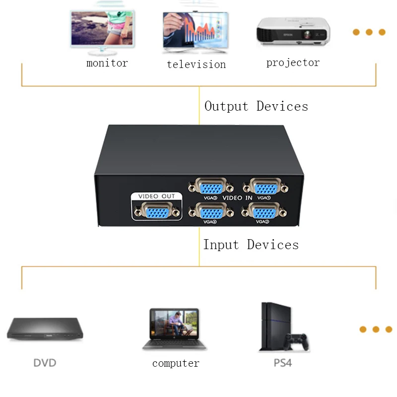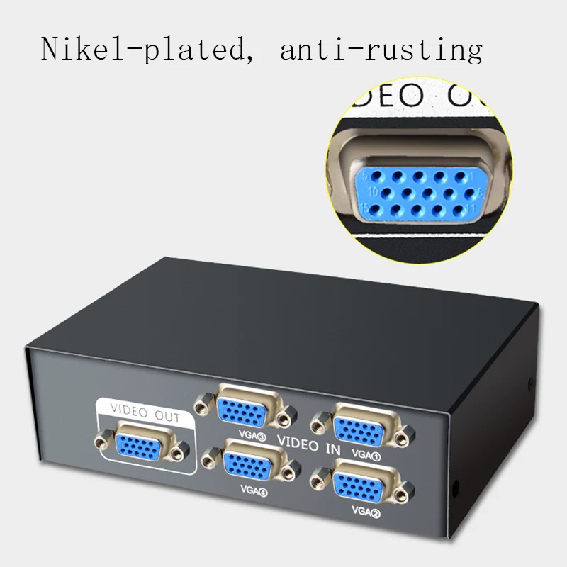 Бренд: JH-linkнаименование изделия: VGA четырехвходной и одновыходный переключатель: металлический корпус цвет: черный контроль: клавишный переключатель Использование: подключи и играй Разрешение: 1920*1440 @ 60 Гц Разъем: никелированный интерфейс