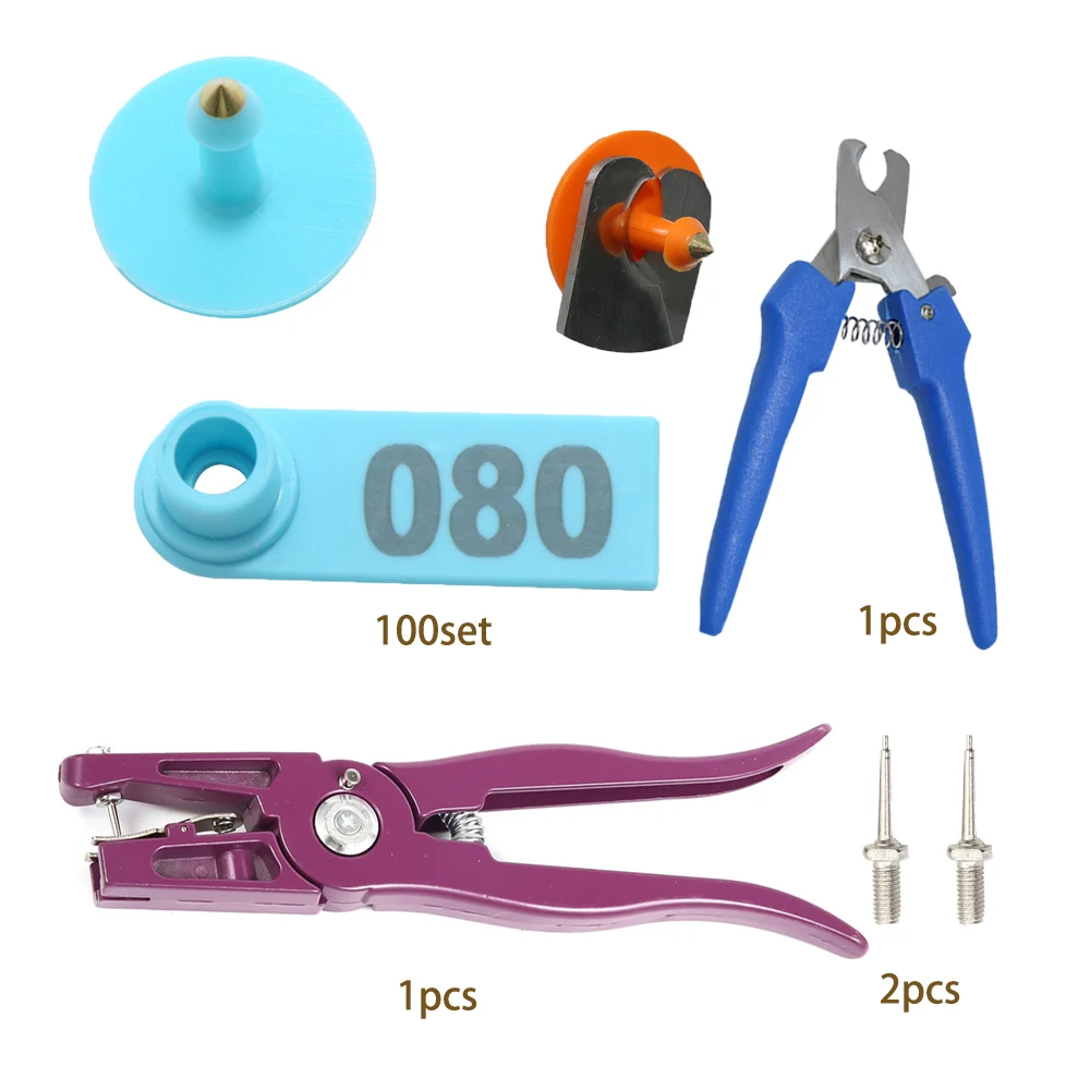 100 шт. Ушная бирка + 2 шт. Ушная бирка игла + 1 шт. фиолетовые щипцы для ушных бирок + 1 шт. кусачки для ушных тегов