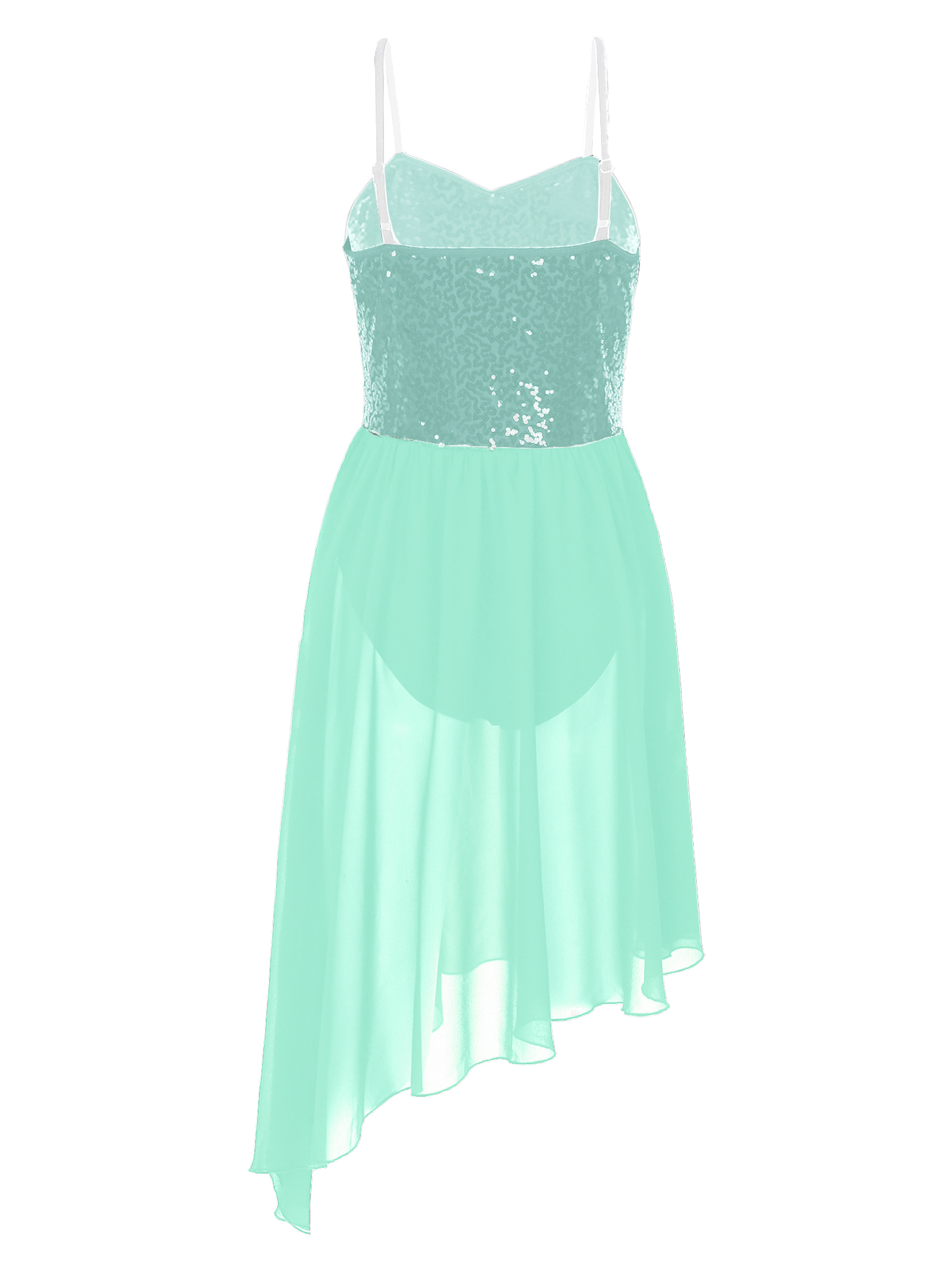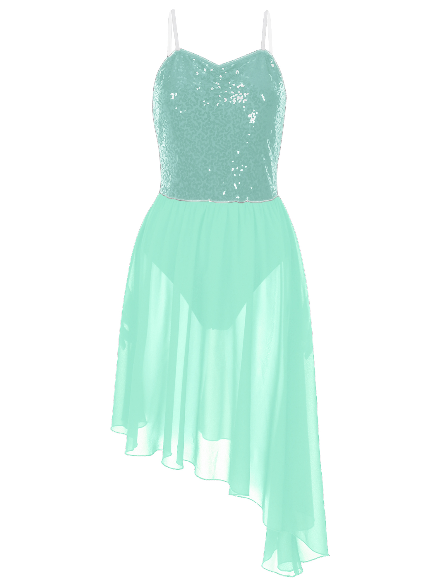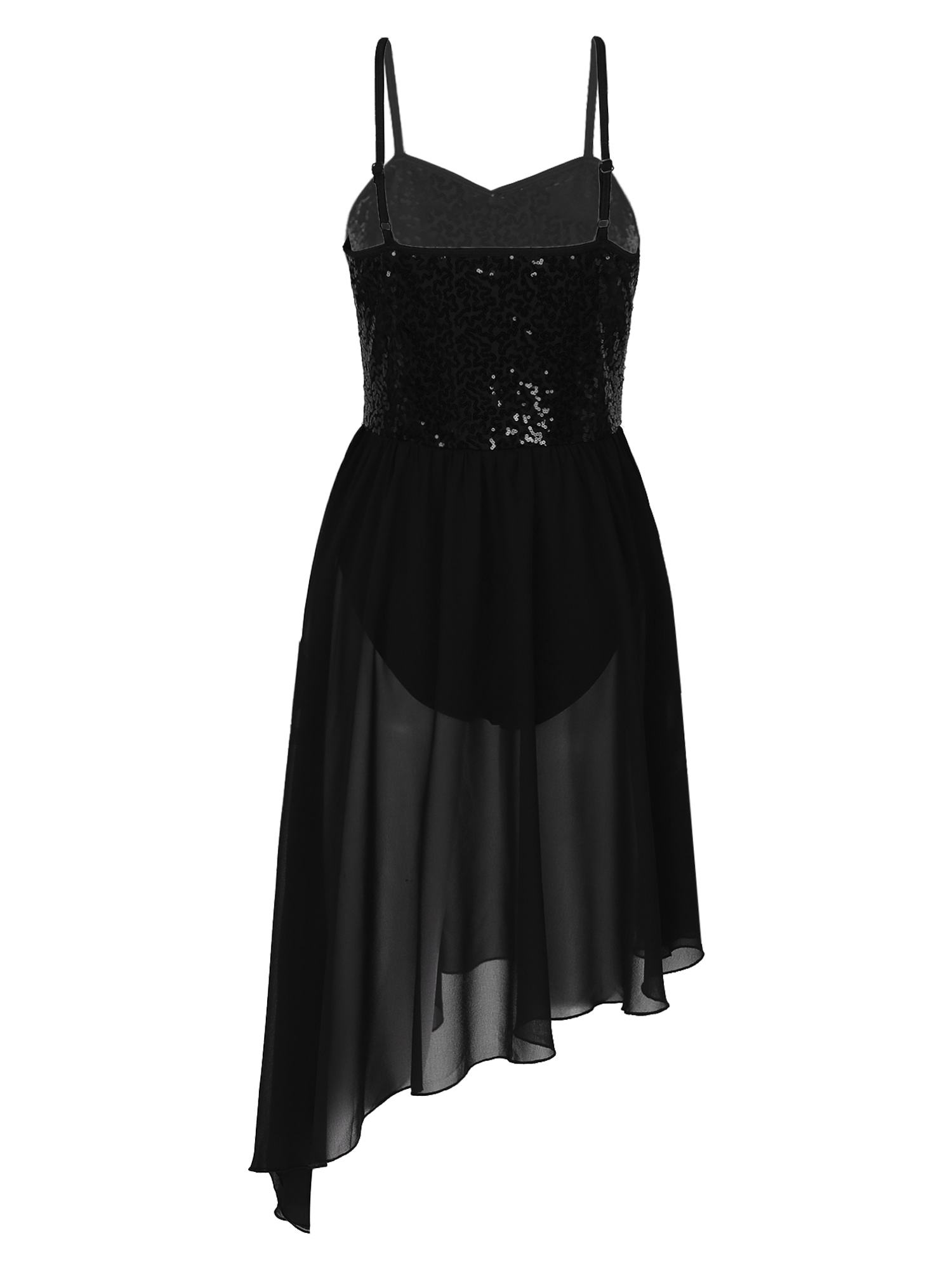Adjustable spaghetti straps, top bodice covered with glitter sequins, waist attached asymmetric chiffon skirt.
