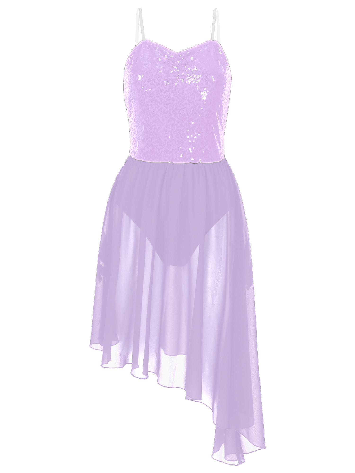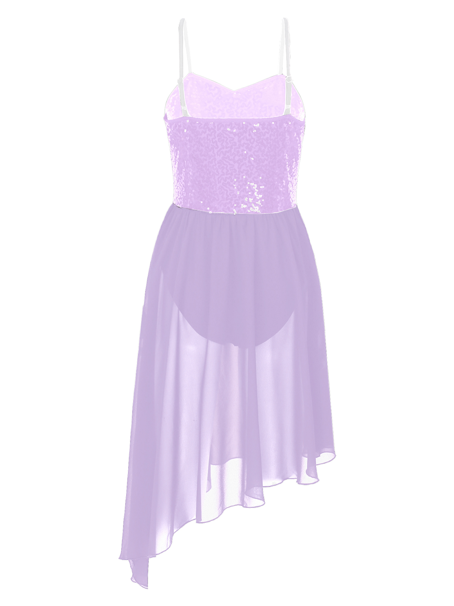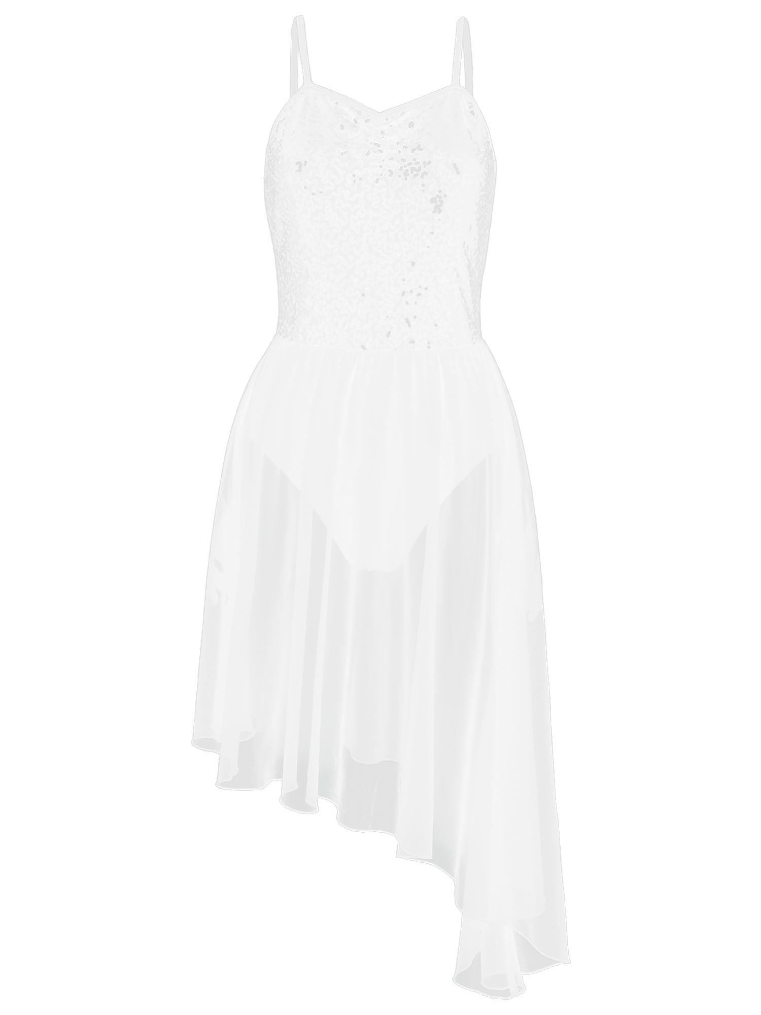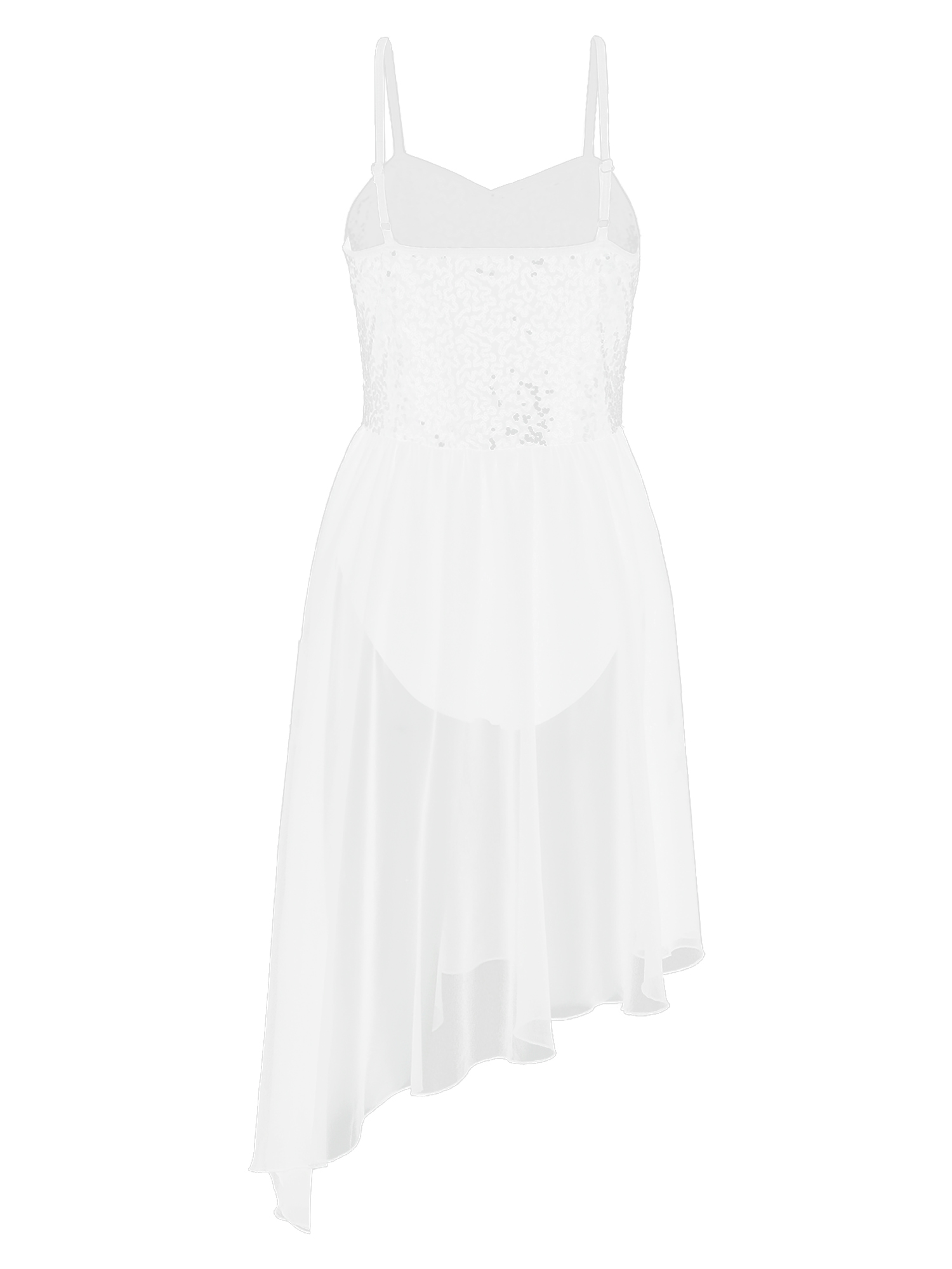 Adjustable spaghetti straps, top bodice covered with glitter sequins, waist attached asymmetric chiffon skirt.