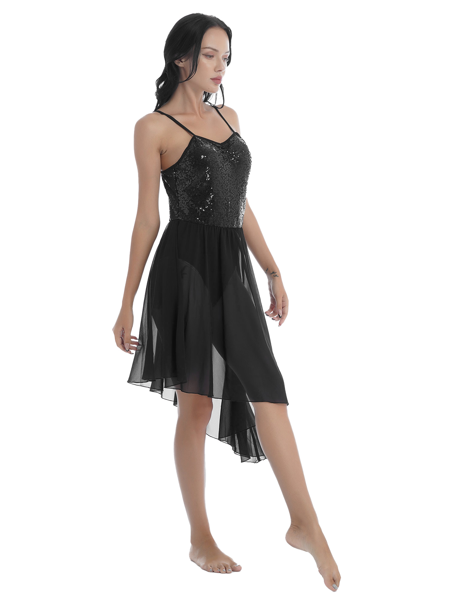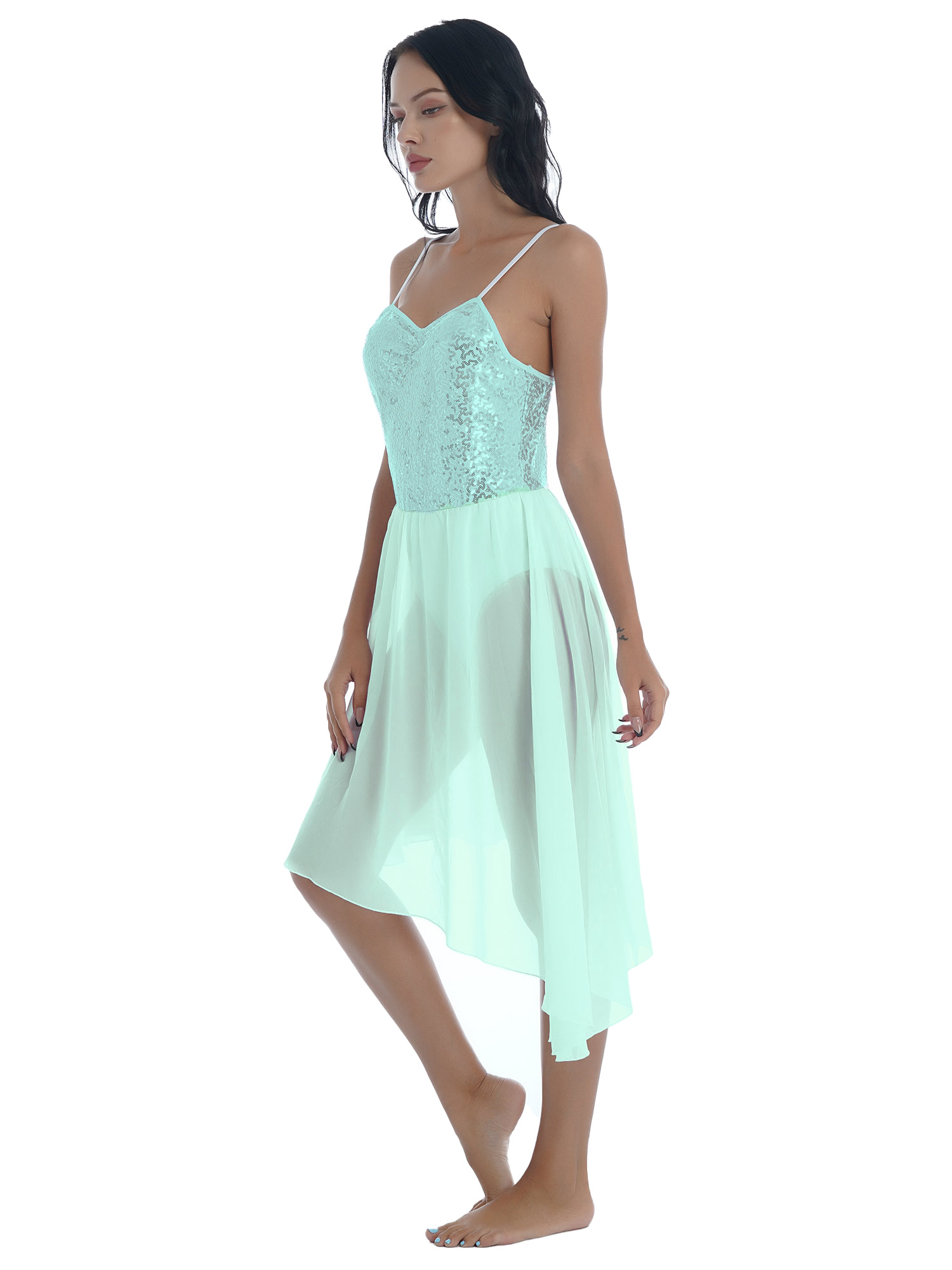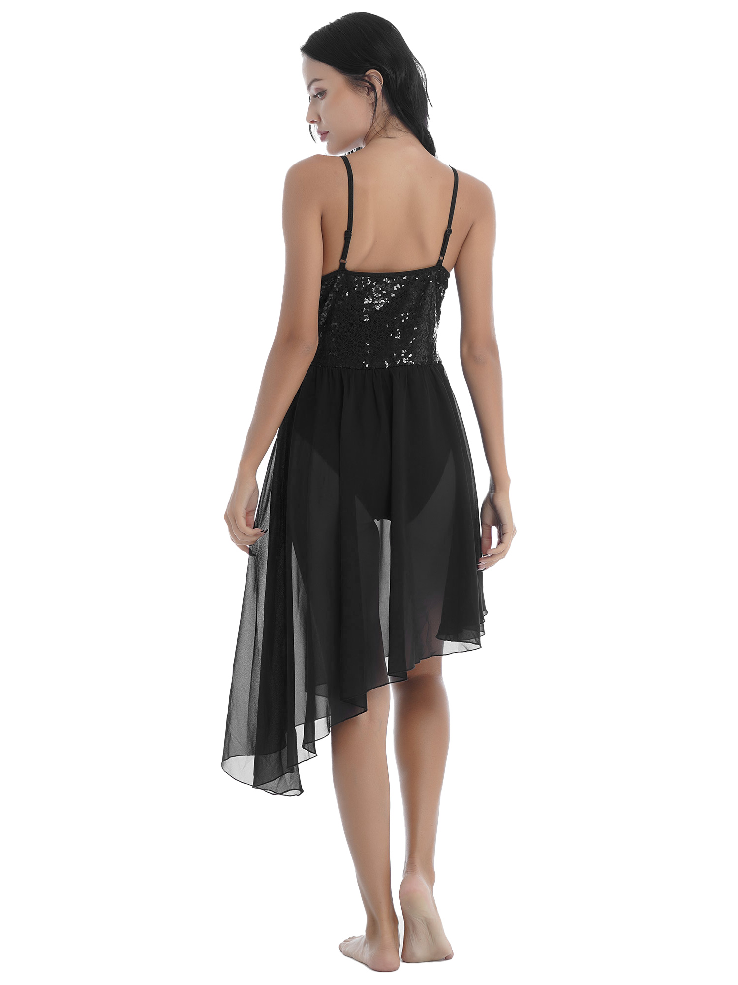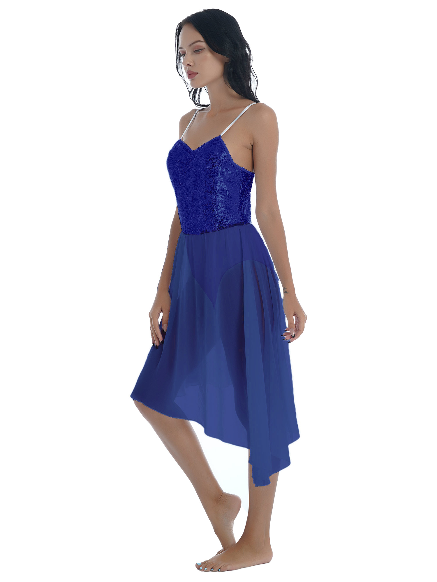 Women Solid Color Shiny Sequin Dance Dress Adjustable Spaghetti Strap Asymmetric Hem Ruffle Dresses.