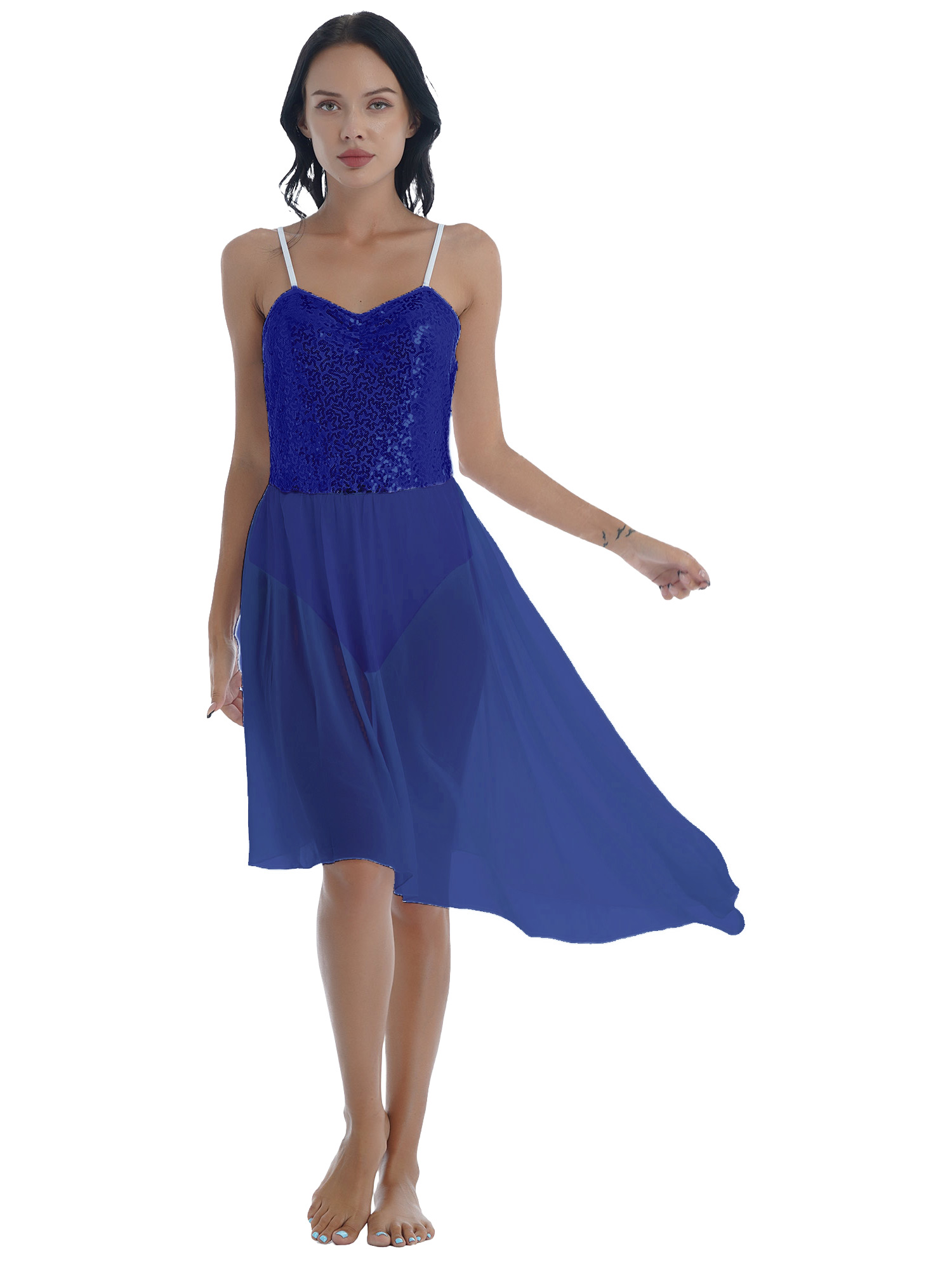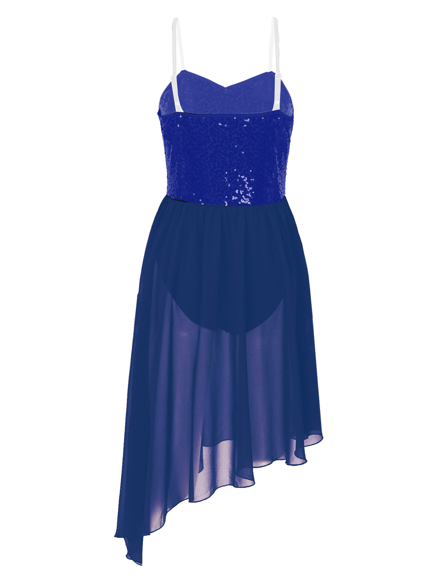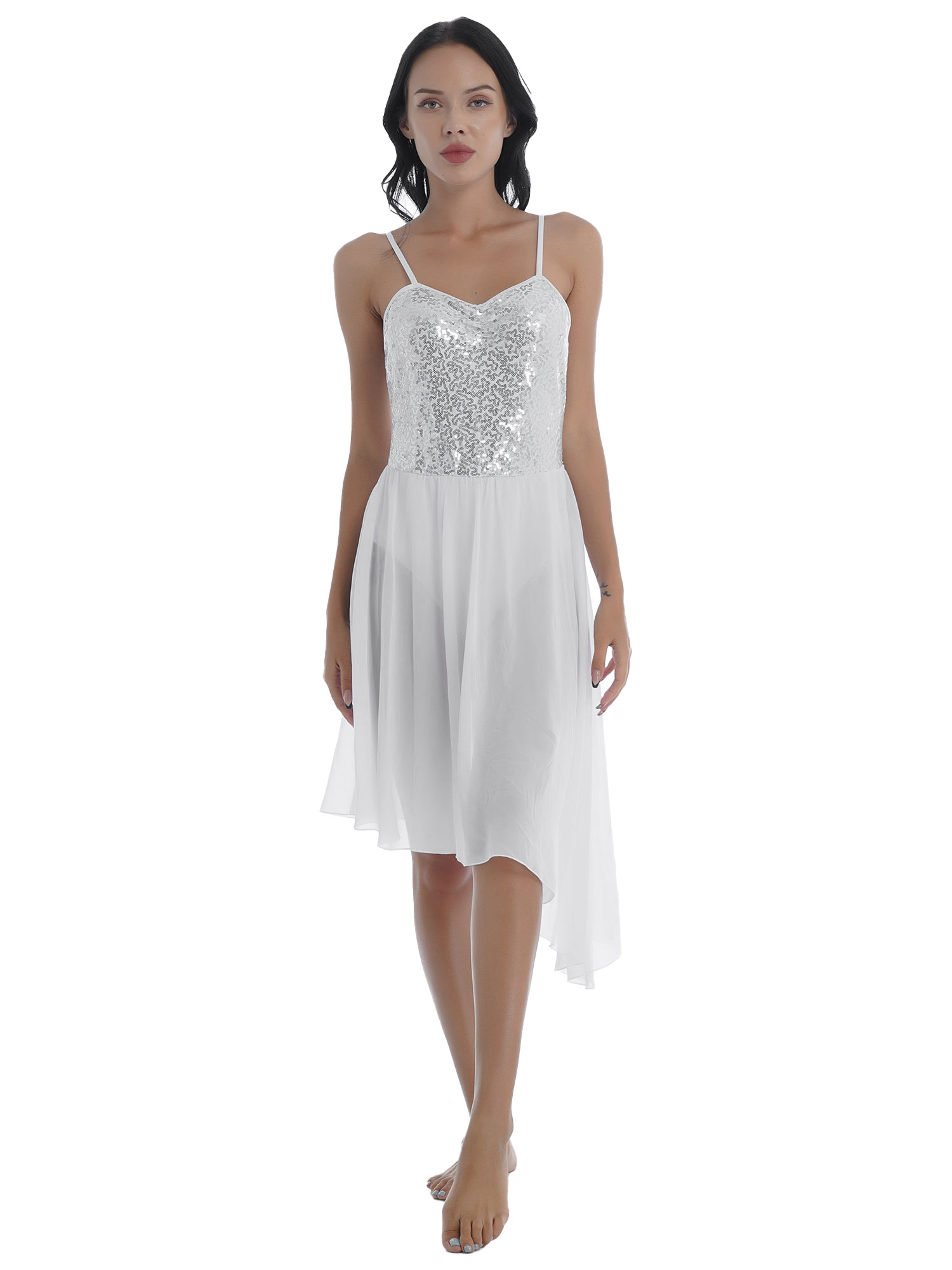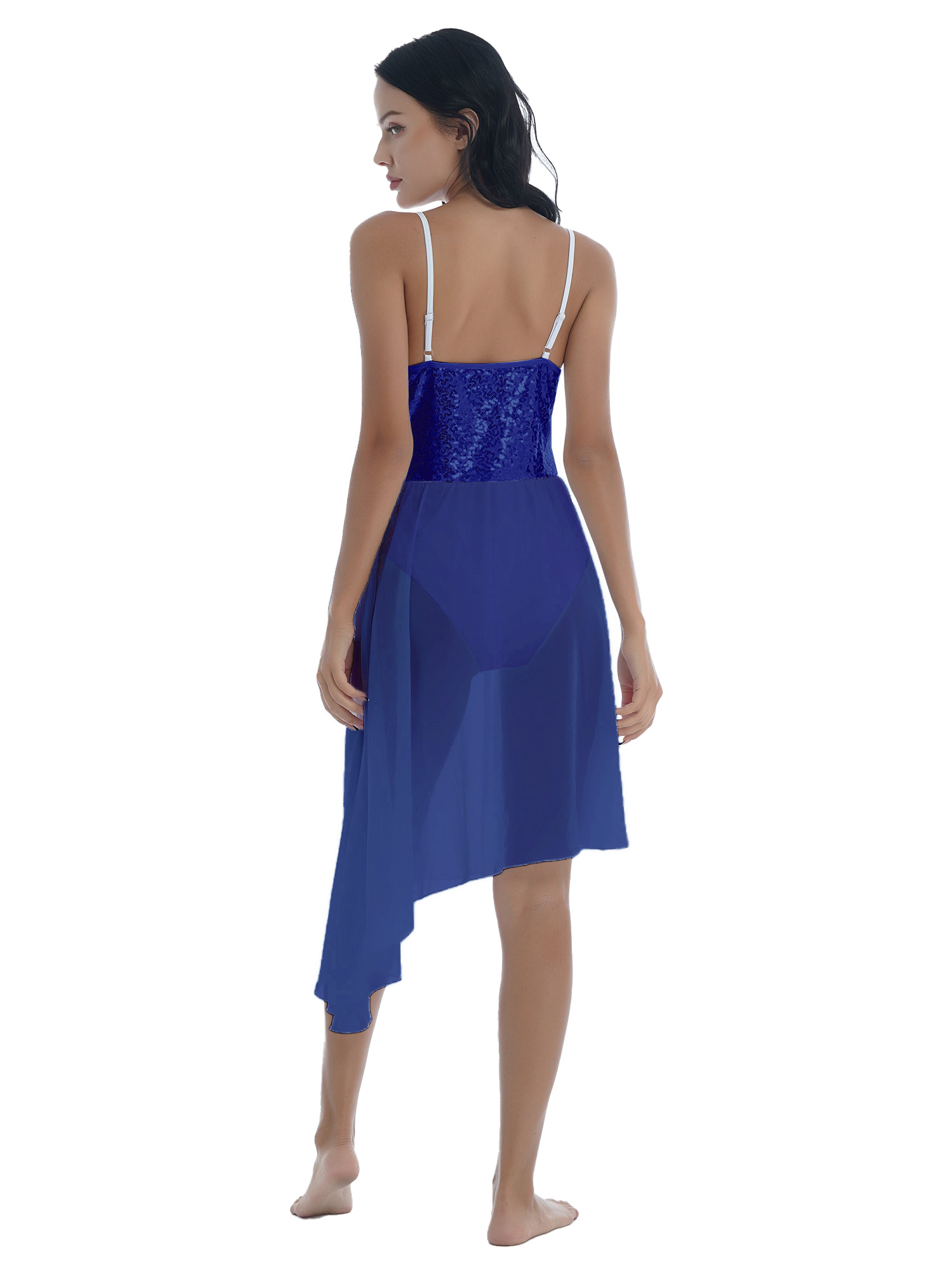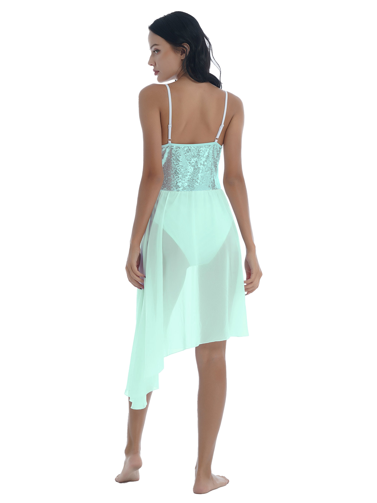 Women Solid Color Shiny Sequin Dance Dress Adjustable Spaghetti Strap Asymmetric Hem Ruffle Dresses.