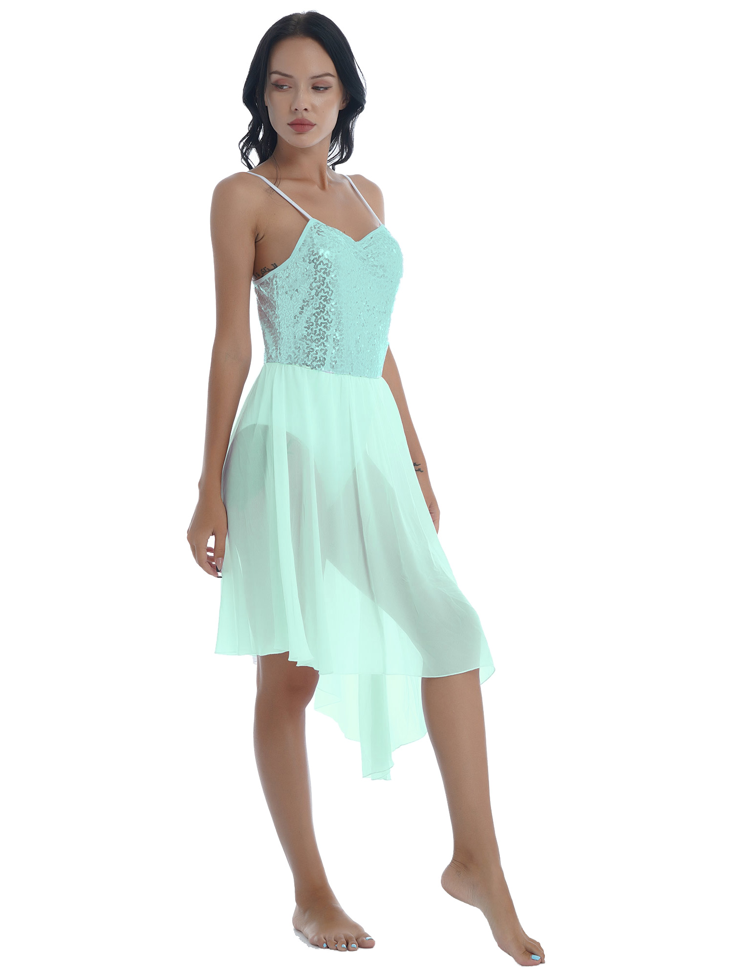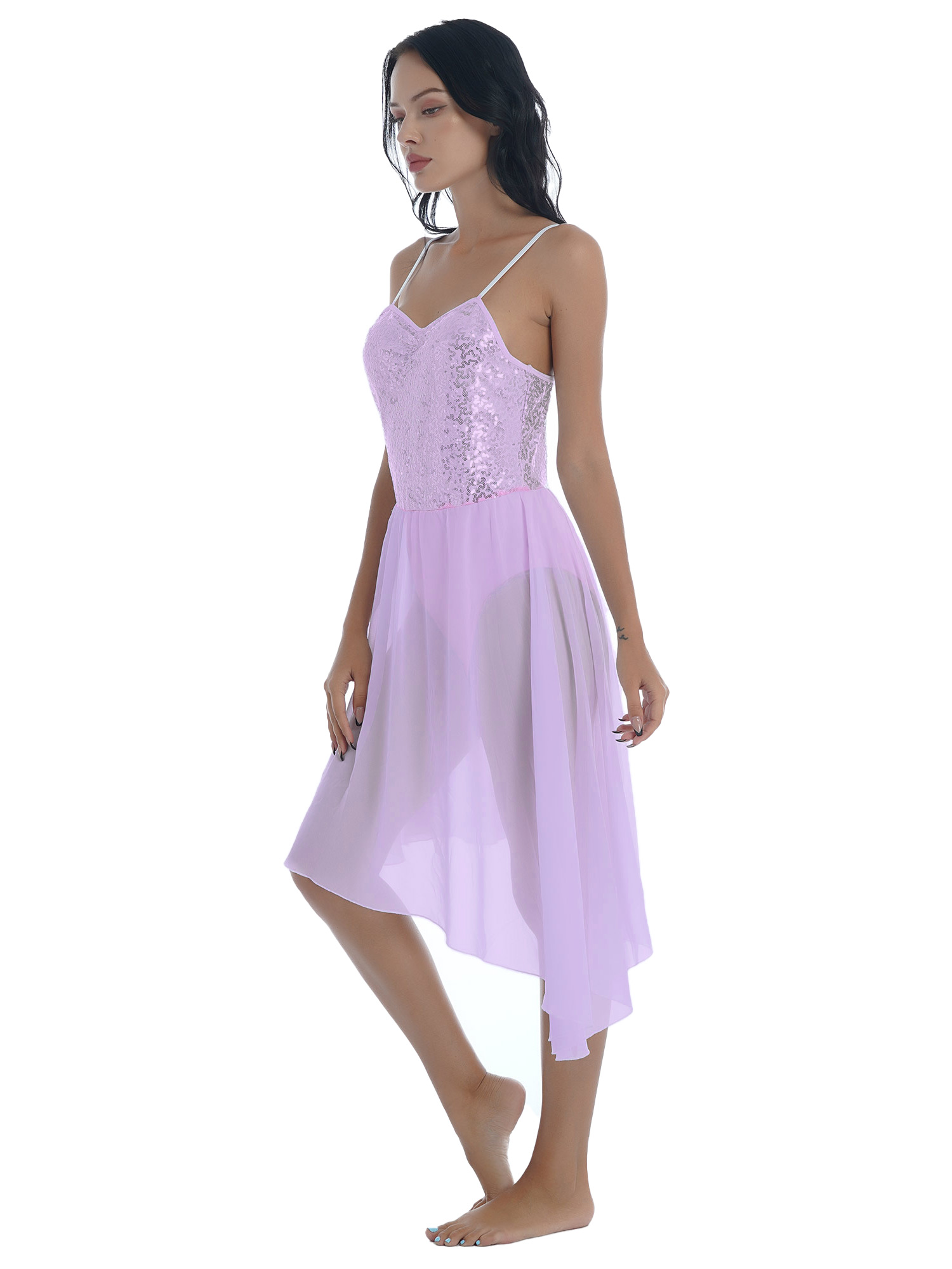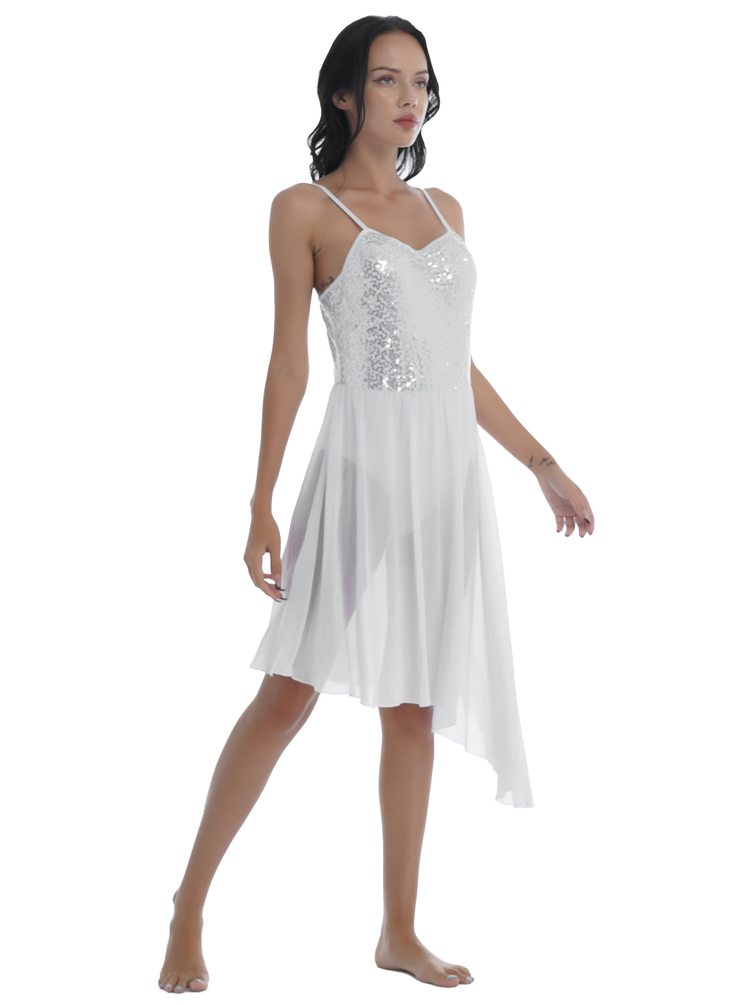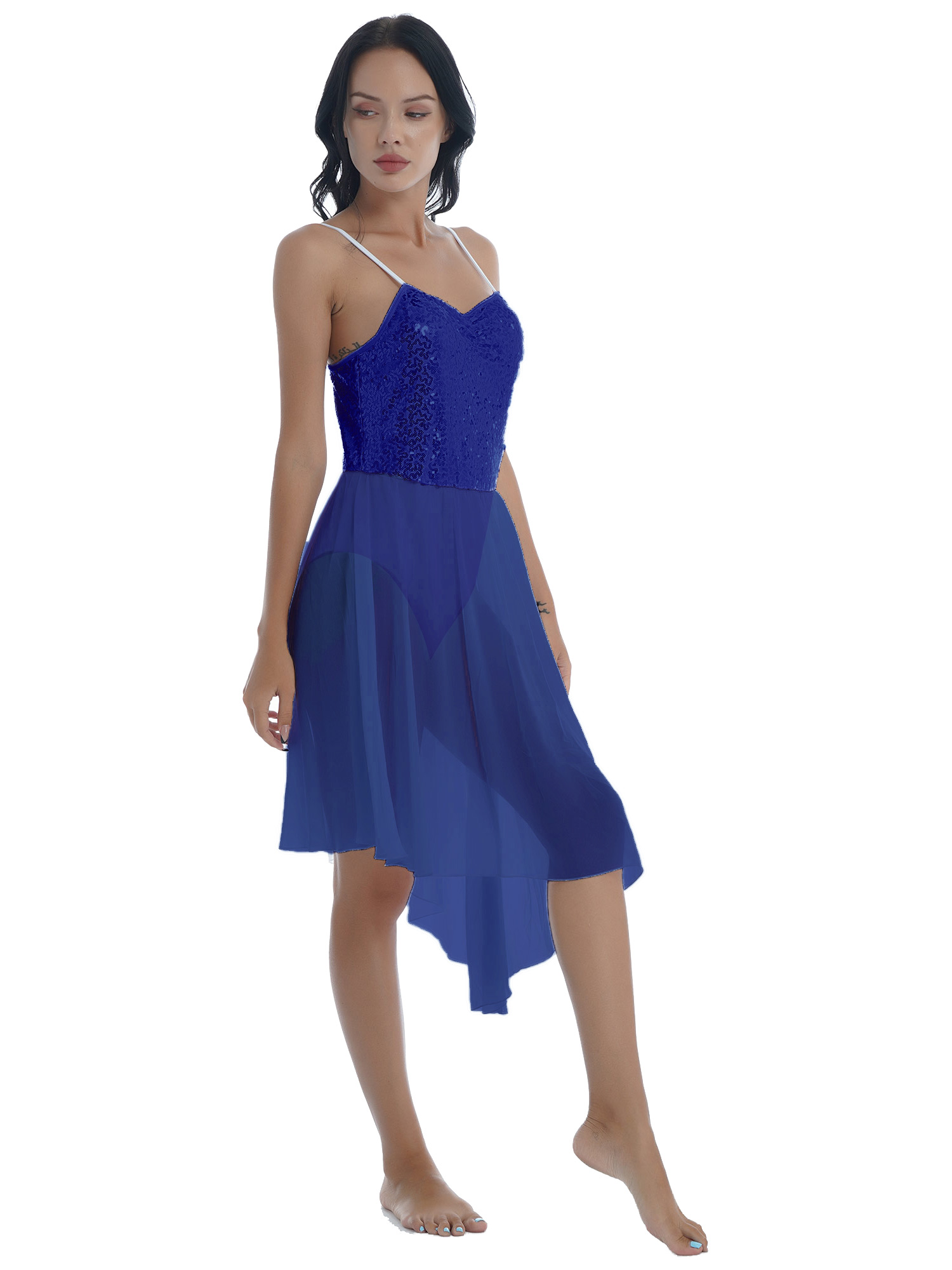 Women Solid Color Shiny Sequin Dance Dress Adjustable Spaghetti Strap Asymmetric Hem Ruffle Dresses.