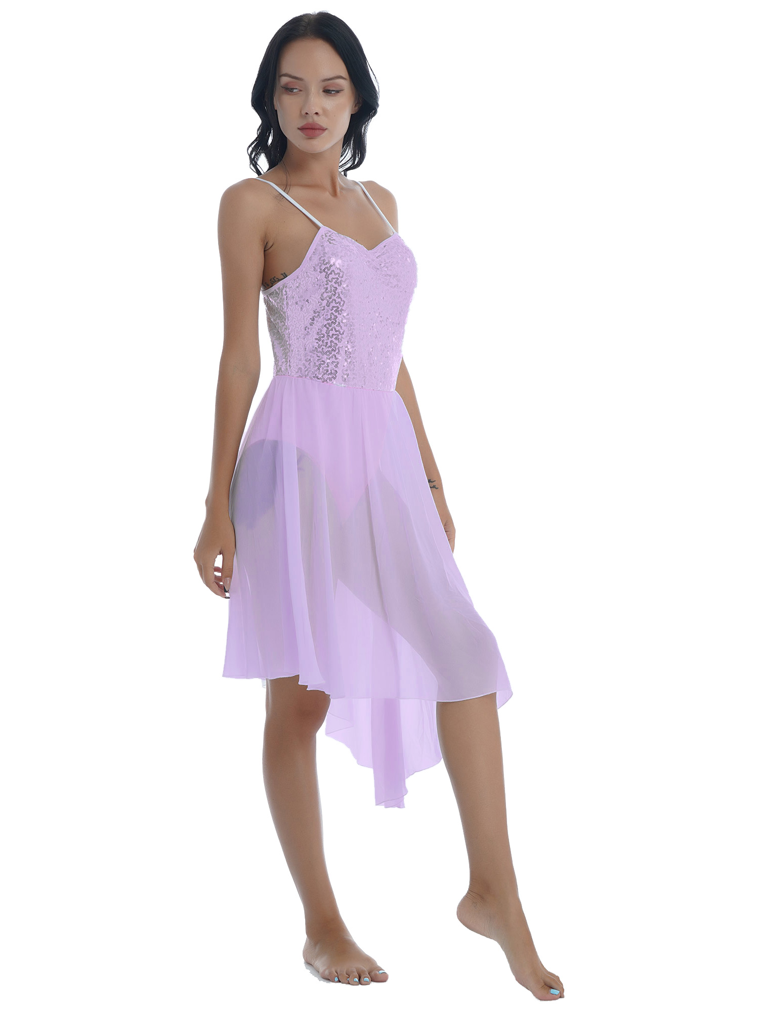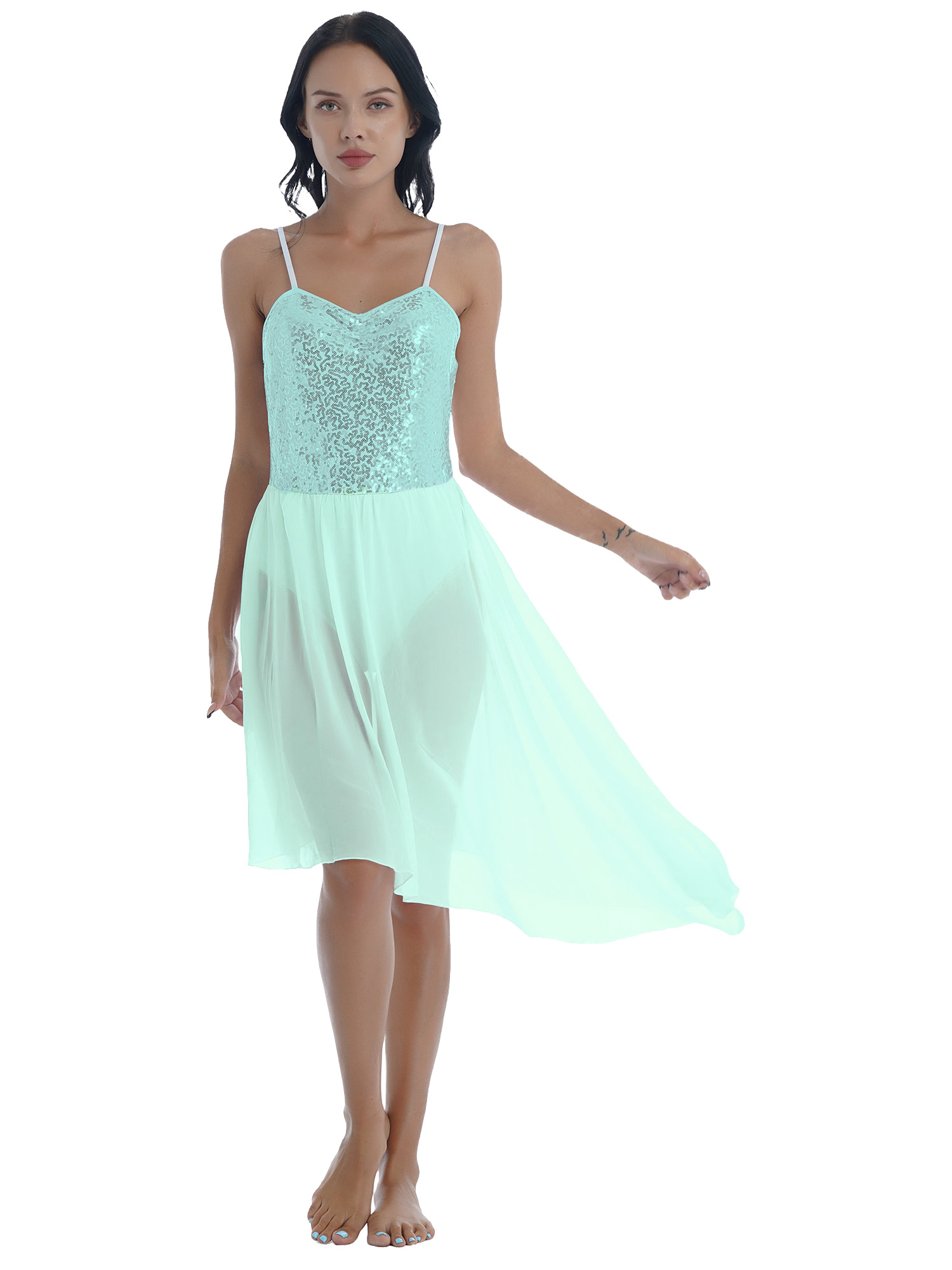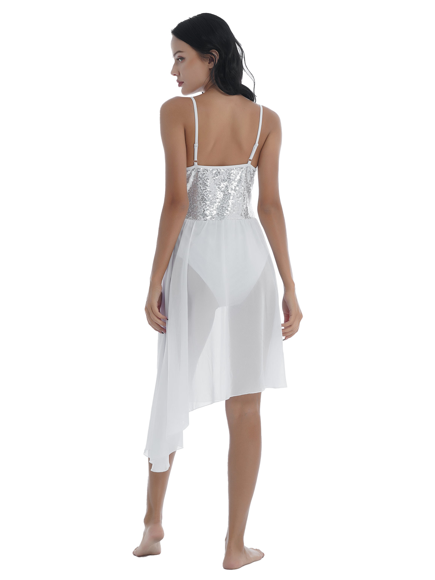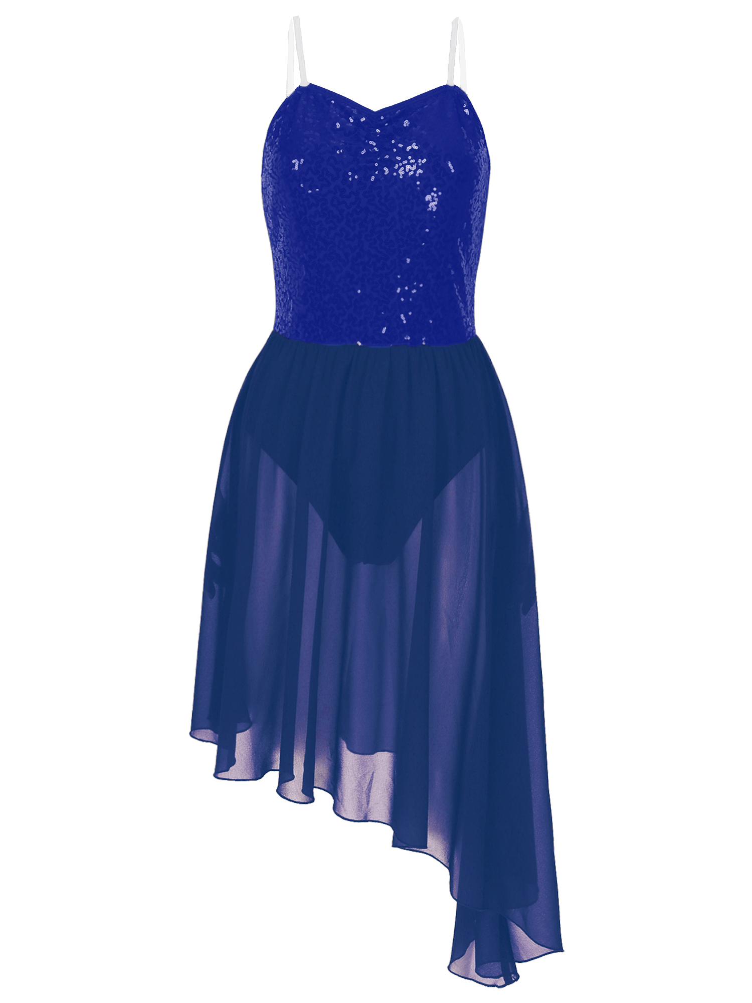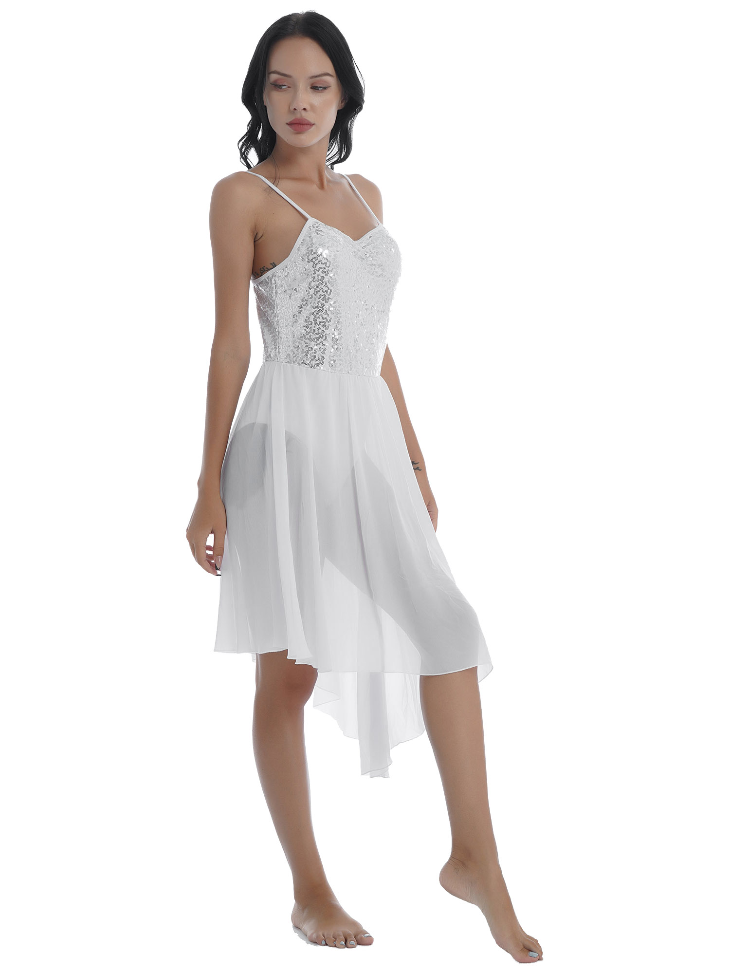 Women Solid Color Shiny Sequin Dance Dress Adjustable Spaghetti Strap Asymmetric Hem Ruffle Dresses.