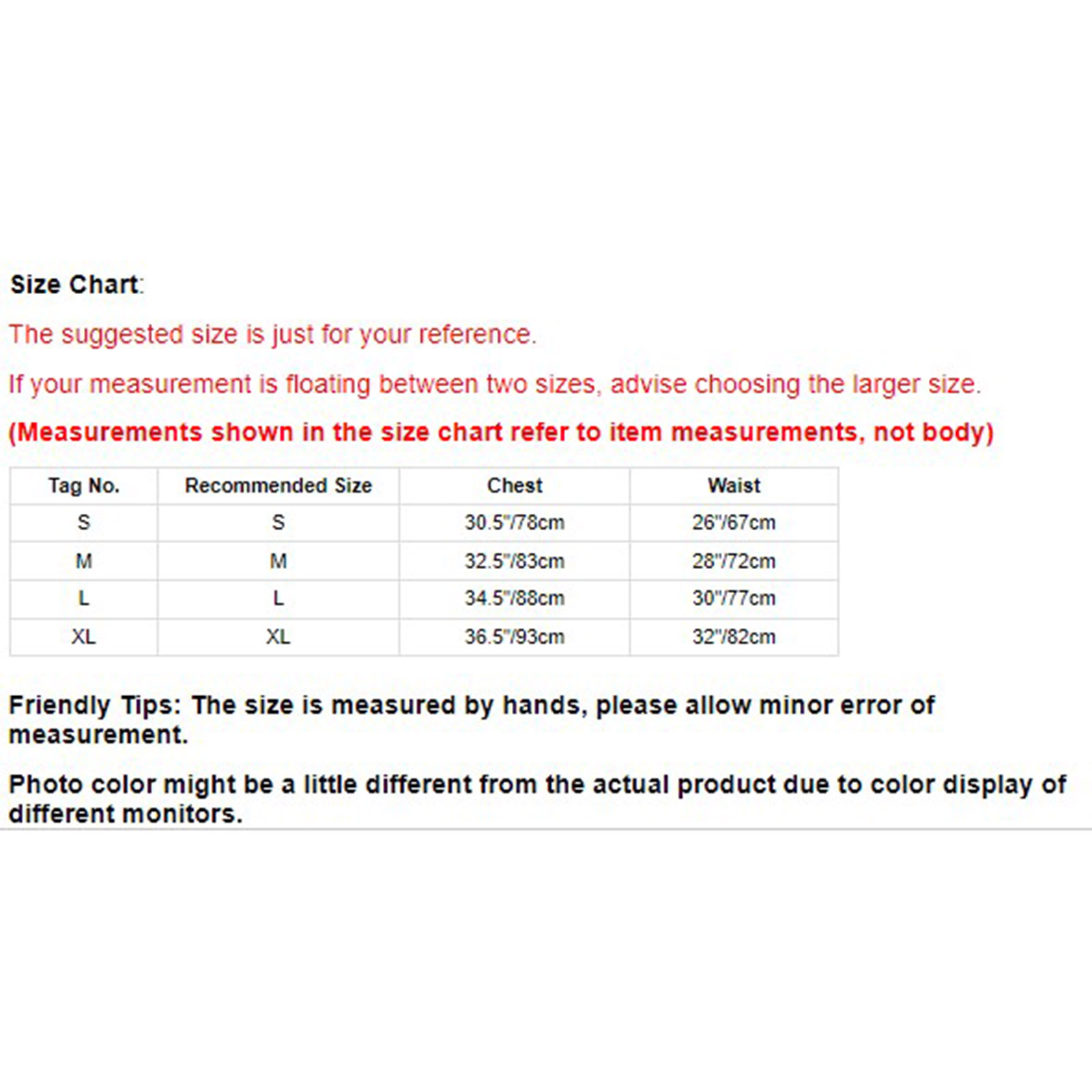 Size Chart: The suggested size is just for your reference. If your measurement is floating between two sizes, advise choosing the larger size. (Measurements shown in the size chart refer to item measurements, not body)