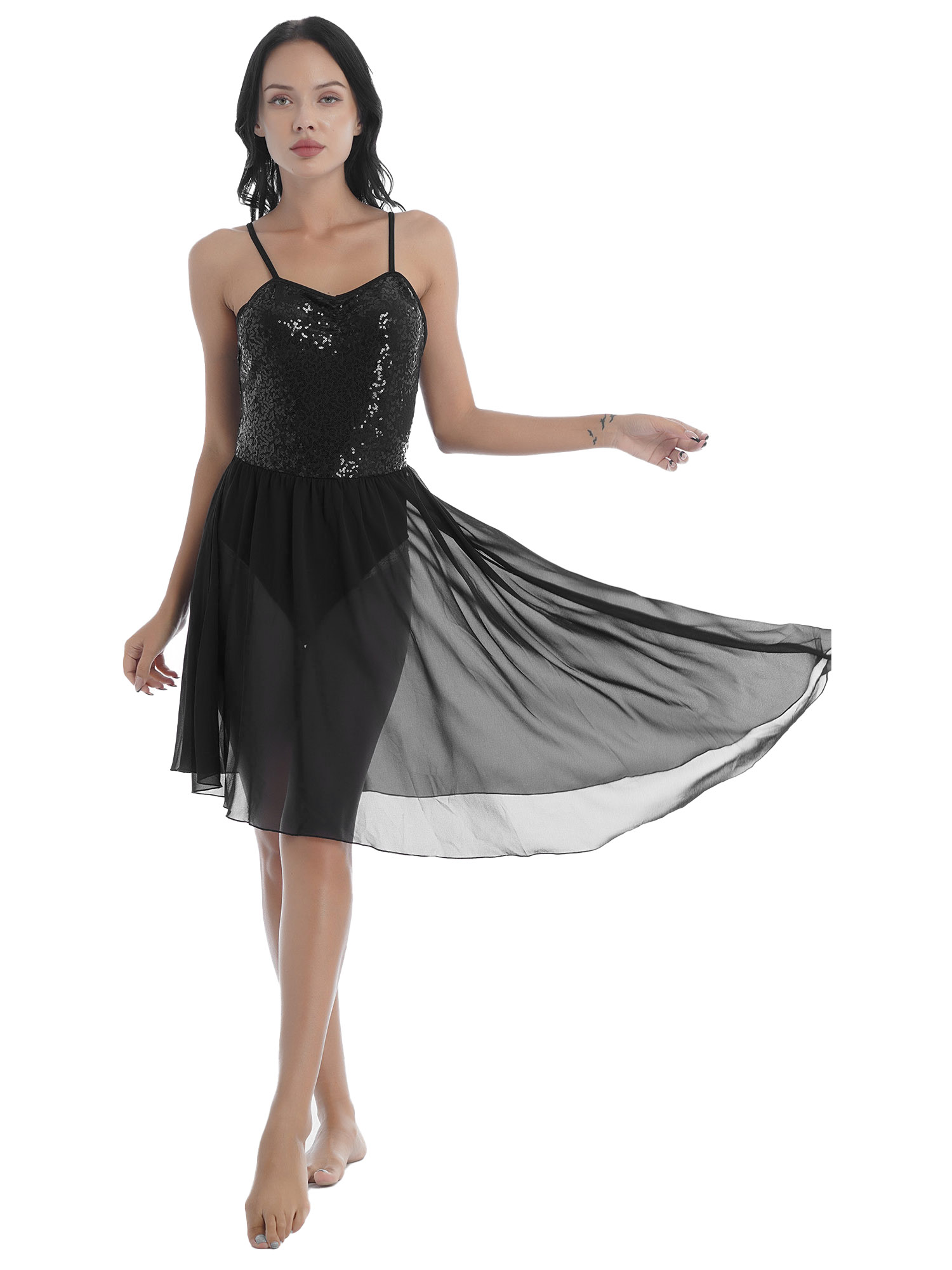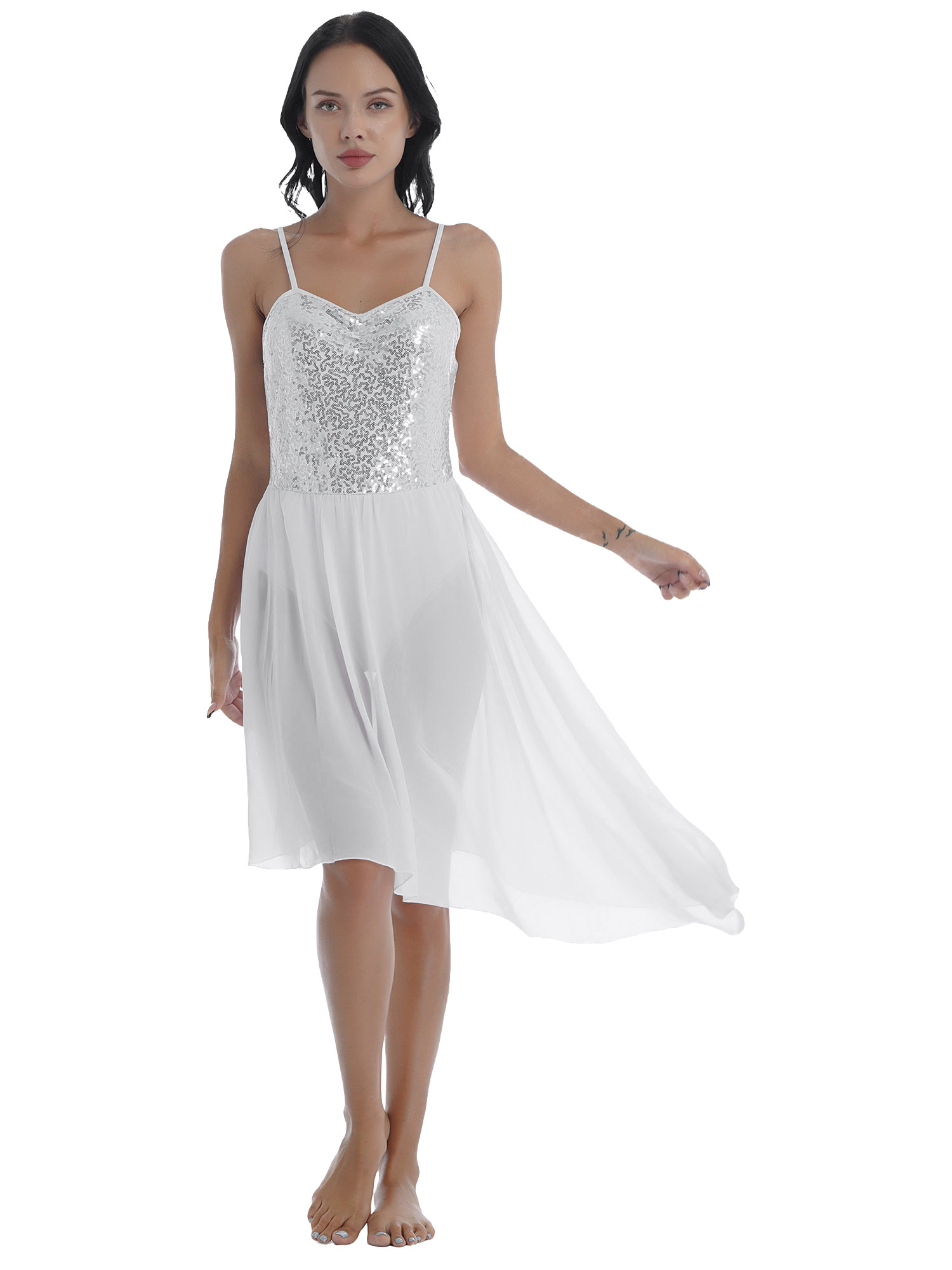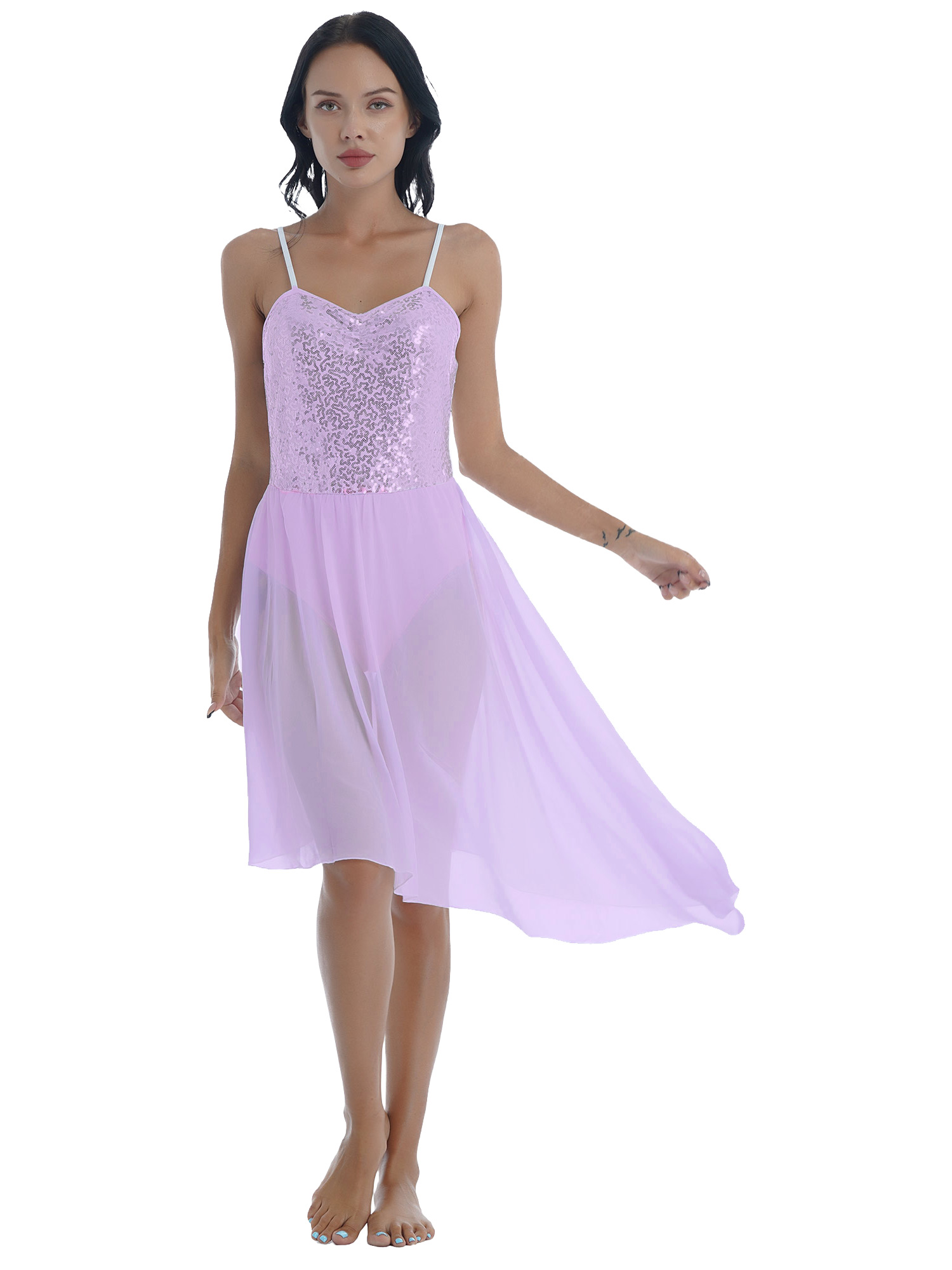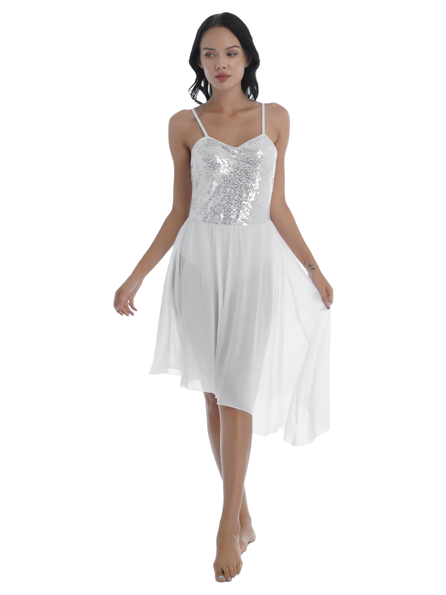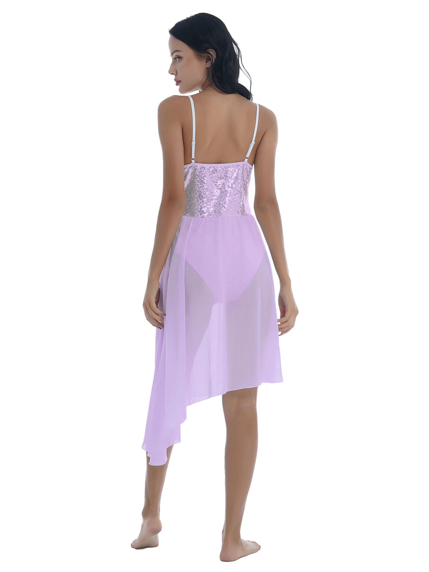 #S-XL Women Solid Color Shiny Sequin Dance Dress Adjustable Spaghetti Strap Asymmetric Hem Ruffle Dresses