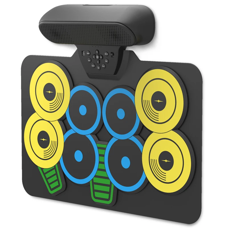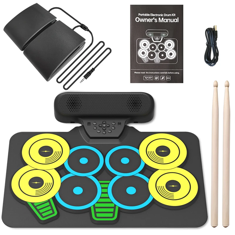 Он поставляется с набором палочек и двумя педалями, чтобы вы чувствовали себя как будто вы играете в настоящий набор барабанов. Это здорово и Лучший музыкальный подарок для детей.