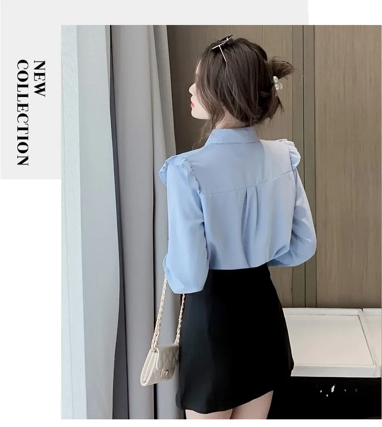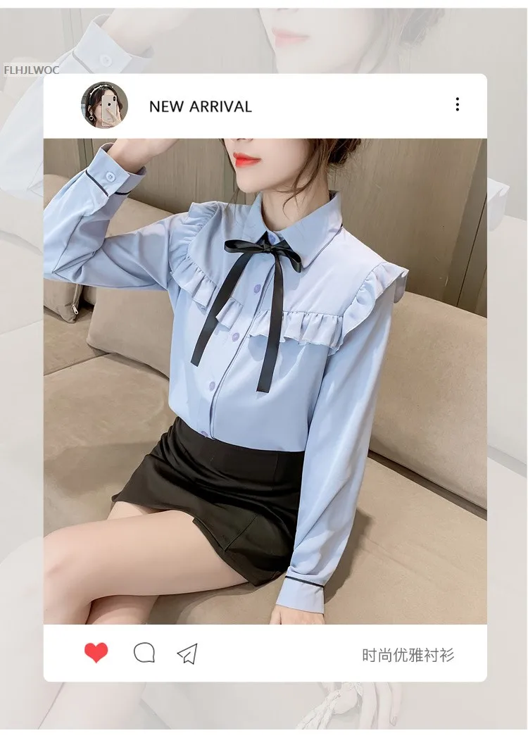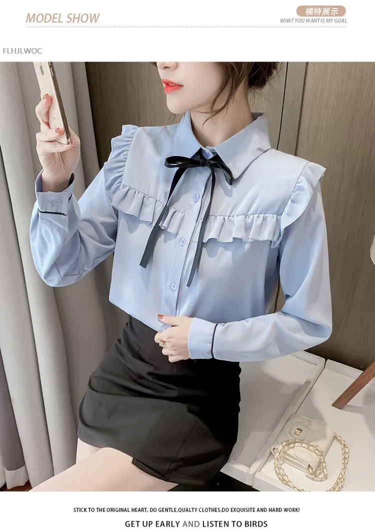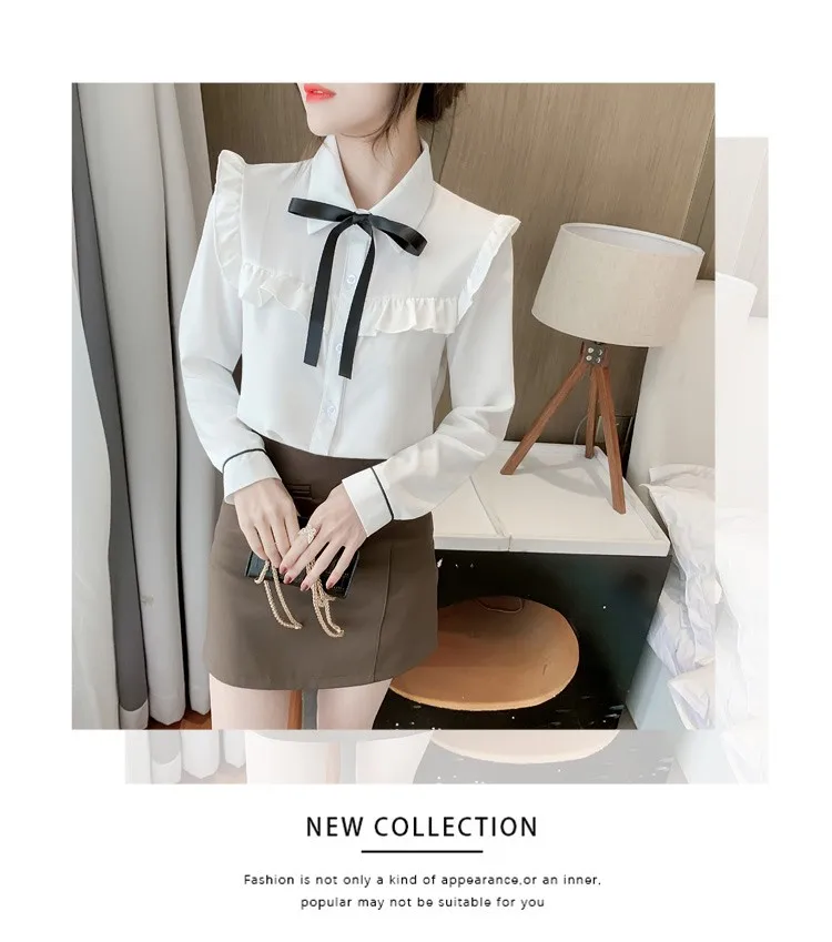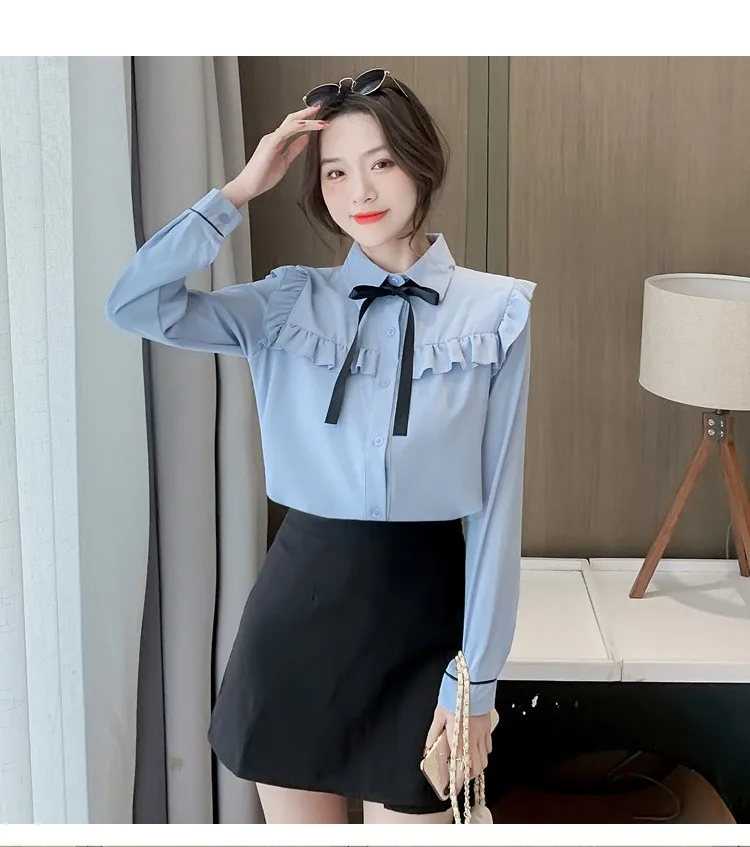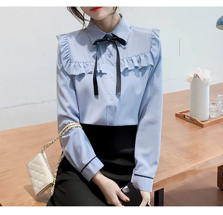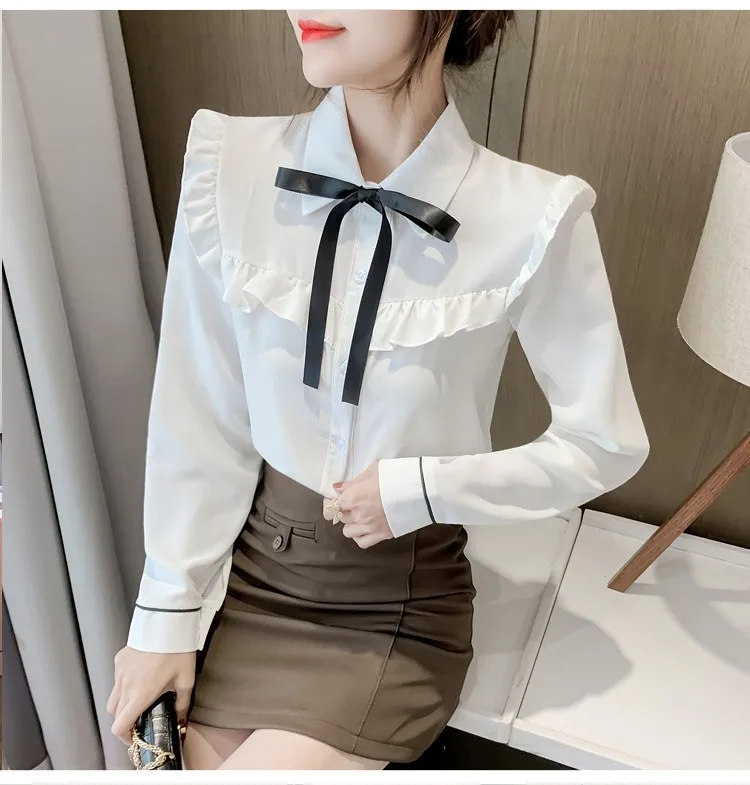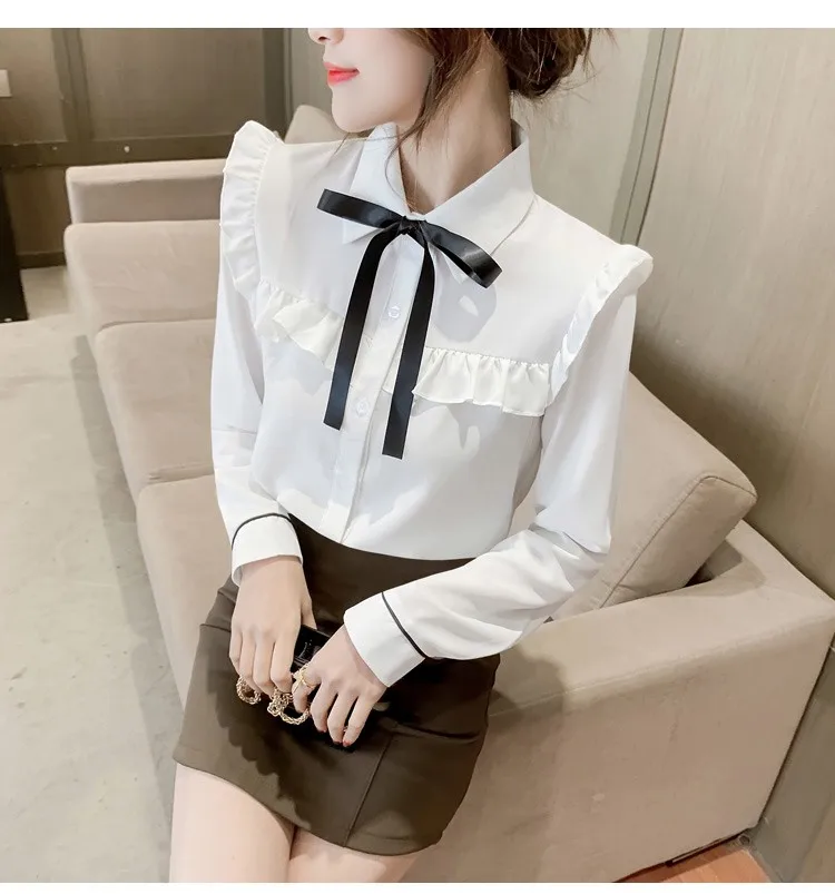 Женские топы с оборками и галстуком-бабочкой, милые свободные однобортные однотонные белые винтажные классические рубашки в стиле ретро с воротником Питер Пэн