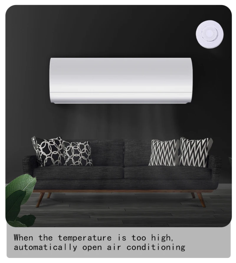 После подключения к приложению, он может быть связан с различными продуктами smart home. Например, при обнаружении чрезмерного формальдегида/Лос умный очиститель воздуха автоматически включается; Когда превышен углекислый газ, Умный вентилятор свежего воздуха автоматически включается; Когда температура ненормальная, температура кондиционера автоматически регулируется; Когда влажность слишком низкая или слишком высокая, Смарт-увлажнитель будет включаться/выключаться автоматически; Когда определённый параметр будет обнаружен, чтобы превысить стандарт, на будильник будет отправлено сообщение (вышеуказанная функция умной связи должна быть совместима с продуктом smart home)