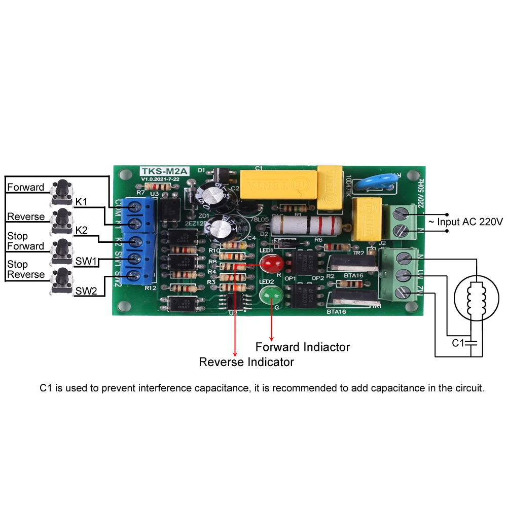 TKS-M2A-это двунаправленный модуль ler для управления двигателем переменного тока 220 В с автоматической блокировкой при помощи пускового механизма низкого уровня. Пользователи могут запускать и управлять передним и обратным вращением управляемого светодиодного оборудования в соответствии с потребностями, такими как автоматический переключатель штор, автоматическое управление ходовым ходом.