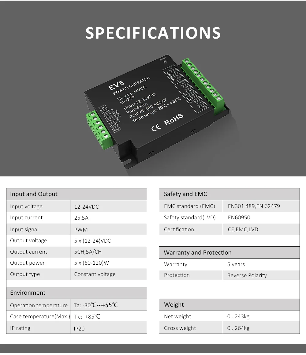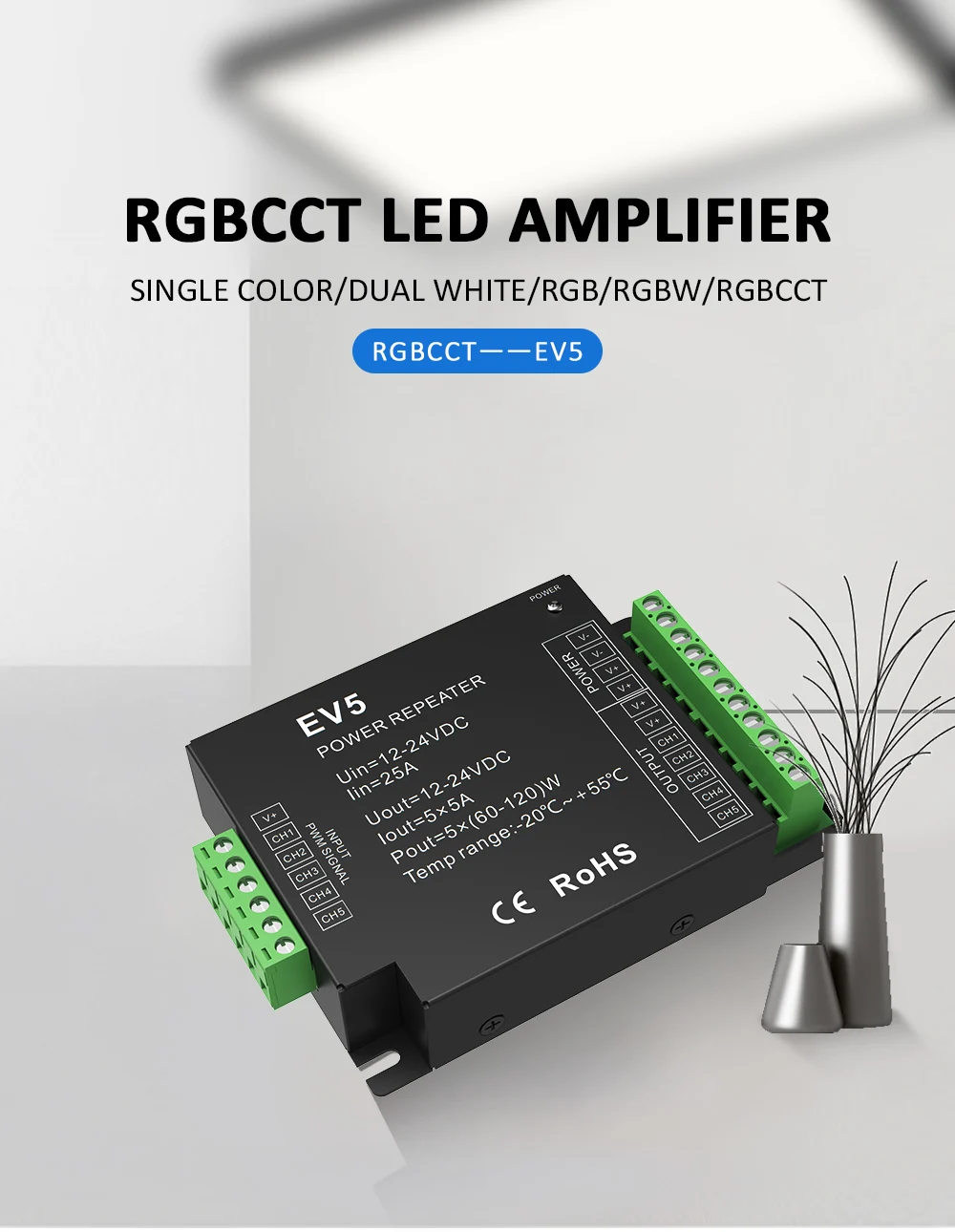 ● 12-24 в ретранслятор постоянного напряжения. ● 5 каналов, 5А на канал. ● Чтобы получить контроль сигнала PWM. ● ретранслятор питания в серии или параллельно, чтобы неограниченно расширить выход. ● Нанесите на RGB + CCT светодиодный модуль или ленту постоянного напряжения.