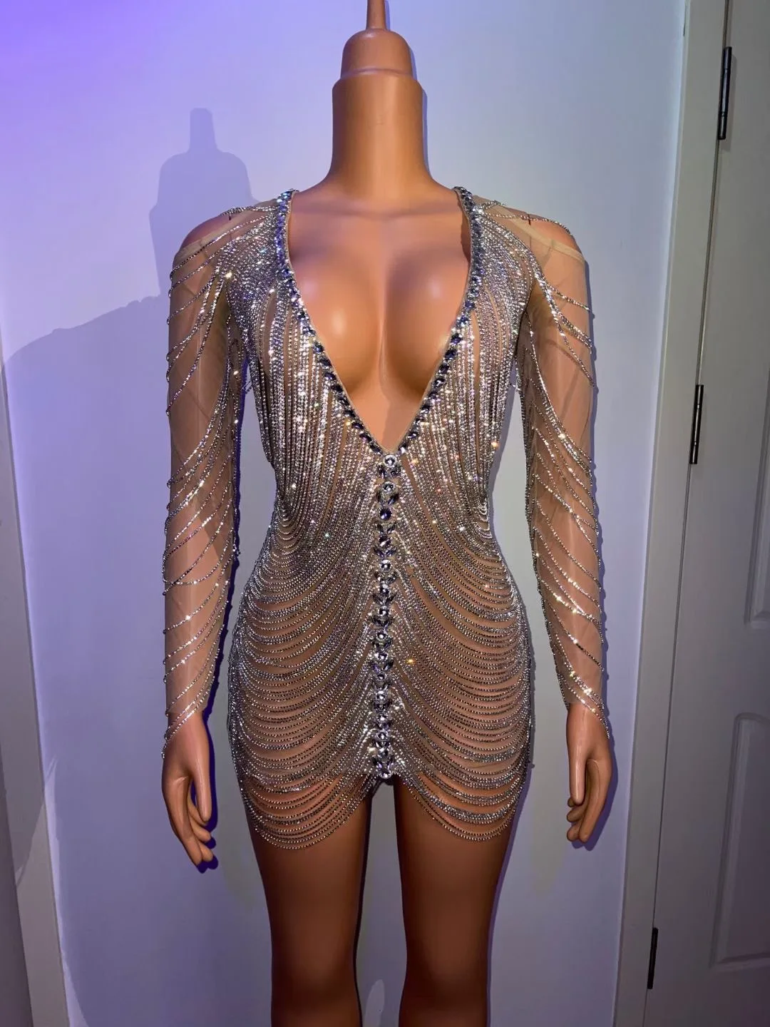 Новый стиль с длинными рукавами серебристый Стразы цепочки платье вечернее платье на день рождения прозрачный наряд для женщин танцор сексуальное платье