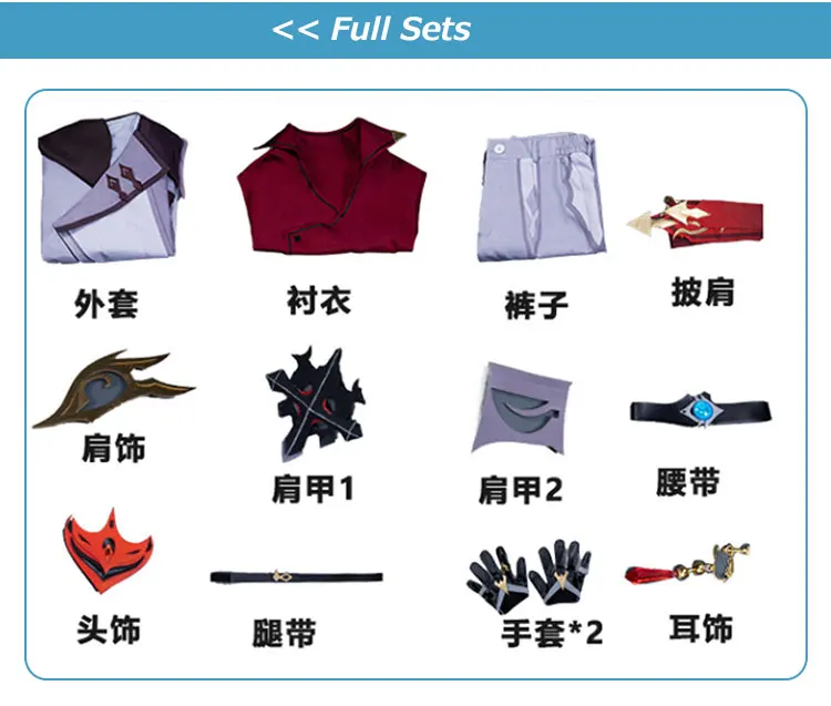 Костюм Tartaglia включает в себя: пальто + брюки + ремень + ремешок + перчатки + опора на спине + опора на руку + опора на плечо + лента + головной убор + Колечки + цепь