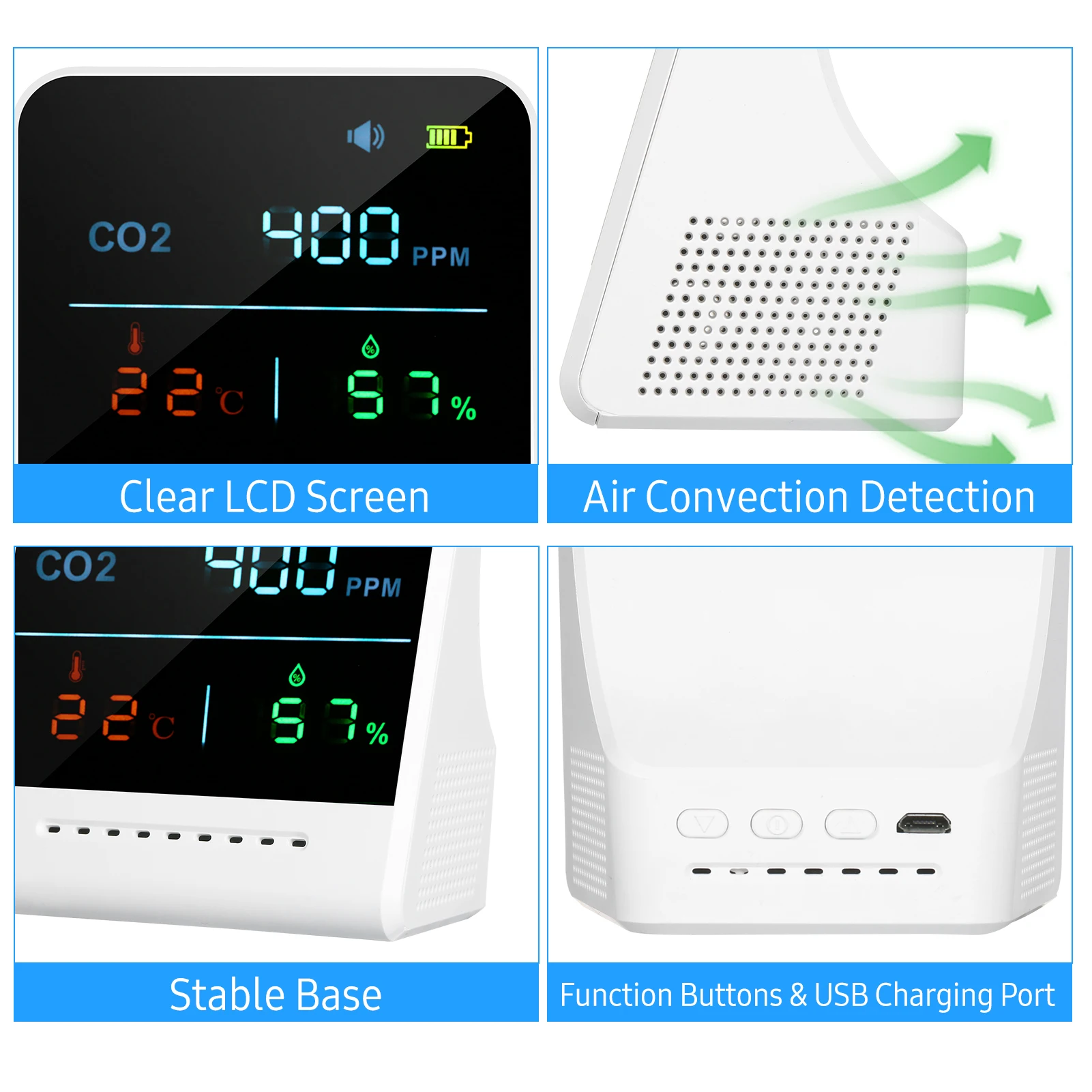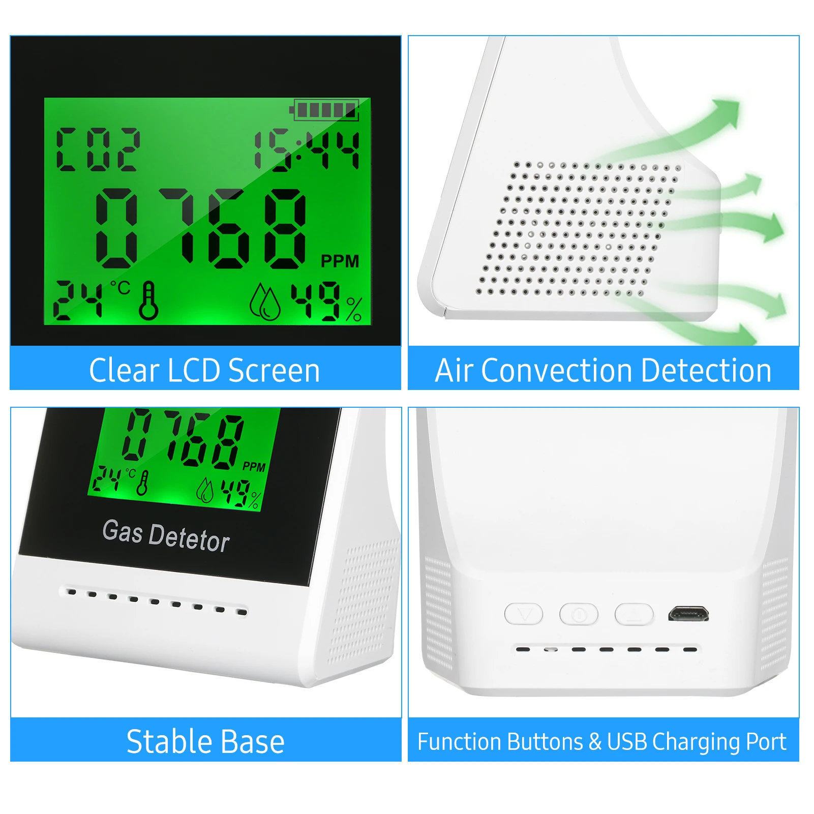 ЖК-экран: Отображает углекислый газ, уровень заряда батареи, температуру и влажность. С большим ЖК-экраном, четким для чтения даже в темноте. Устойчивое Основание, легко размещается на рабочем столе.