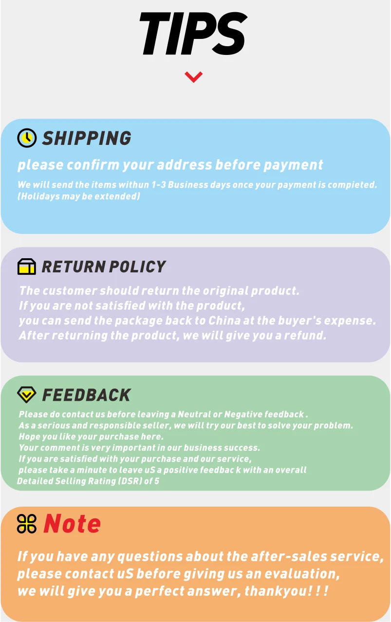 2. Внимательно проверьте таблицу размеров перед покупкой товара. Если вы не уверены, как выбрать размер, пожалуйста, свяжитесь с нашей службой поддержки клиентов.