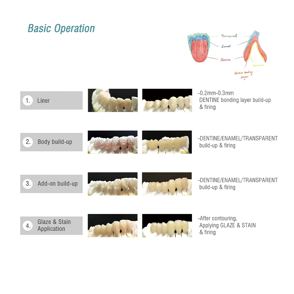 Химический состав фарфорового порошка BAOT-оксид кремния, оксид алюминия, оксид калия, оксид натрия, цирконий, оксид кальция, оксид бора и т. д. Он в основном вводится из калия feldspar, и через катализ он многократно кристаллируется для формирования кристаллов граната, который имеет хорошую биосовместимость, химическую стабильность, Прочность и твердость подходят для ротовой структуры и функции. Во время кристаллизации граната, с помощью контроля процесса, технические требования, такие как прозрачность и прозрачность, могут быть выполнены, чтобы обеспечить хороший искусственный эстетический эффект естественных зубов по сравнению с человеком.