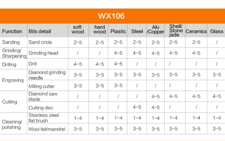 -Низкий уровень шума (3 скорости-WX750; 5 скоростей-WX106), беснагрузочные децибелы 60 децибелов, рабочие децибелы меняются в зависимости от условий работы, около 80 децибелов.