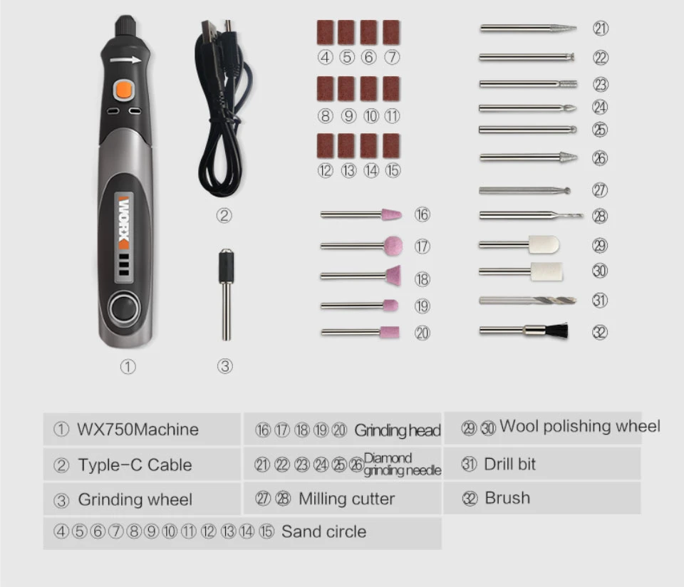 -Тонкий корпус и высокого качества, более удобно держать в руке (WX750 диаметр 37,5, Dremel