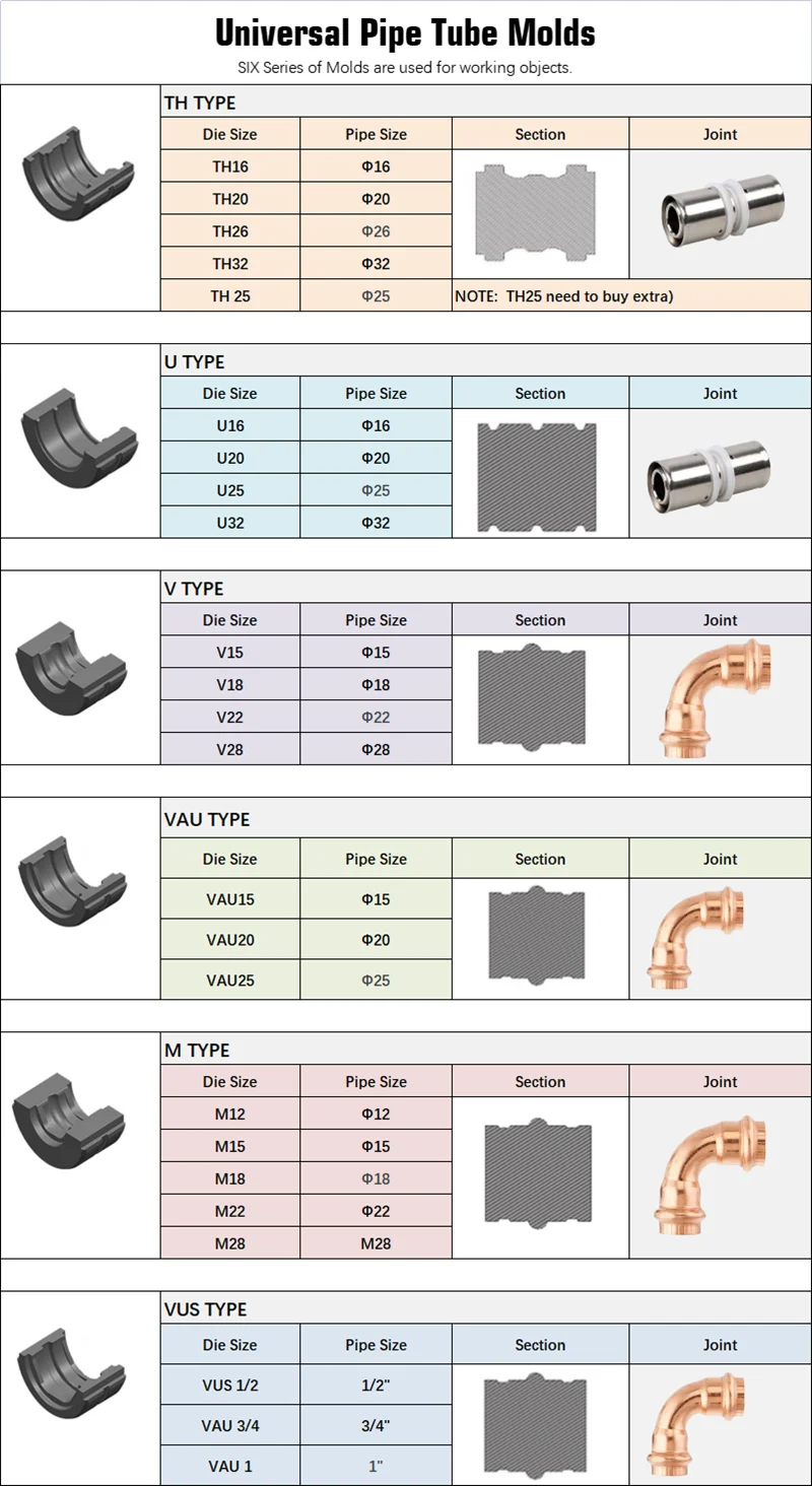 2. Может быть перенесена форма, те же инструменты могут быть прессованы в 12-32 мм от различных спецификаций фитингов труб.