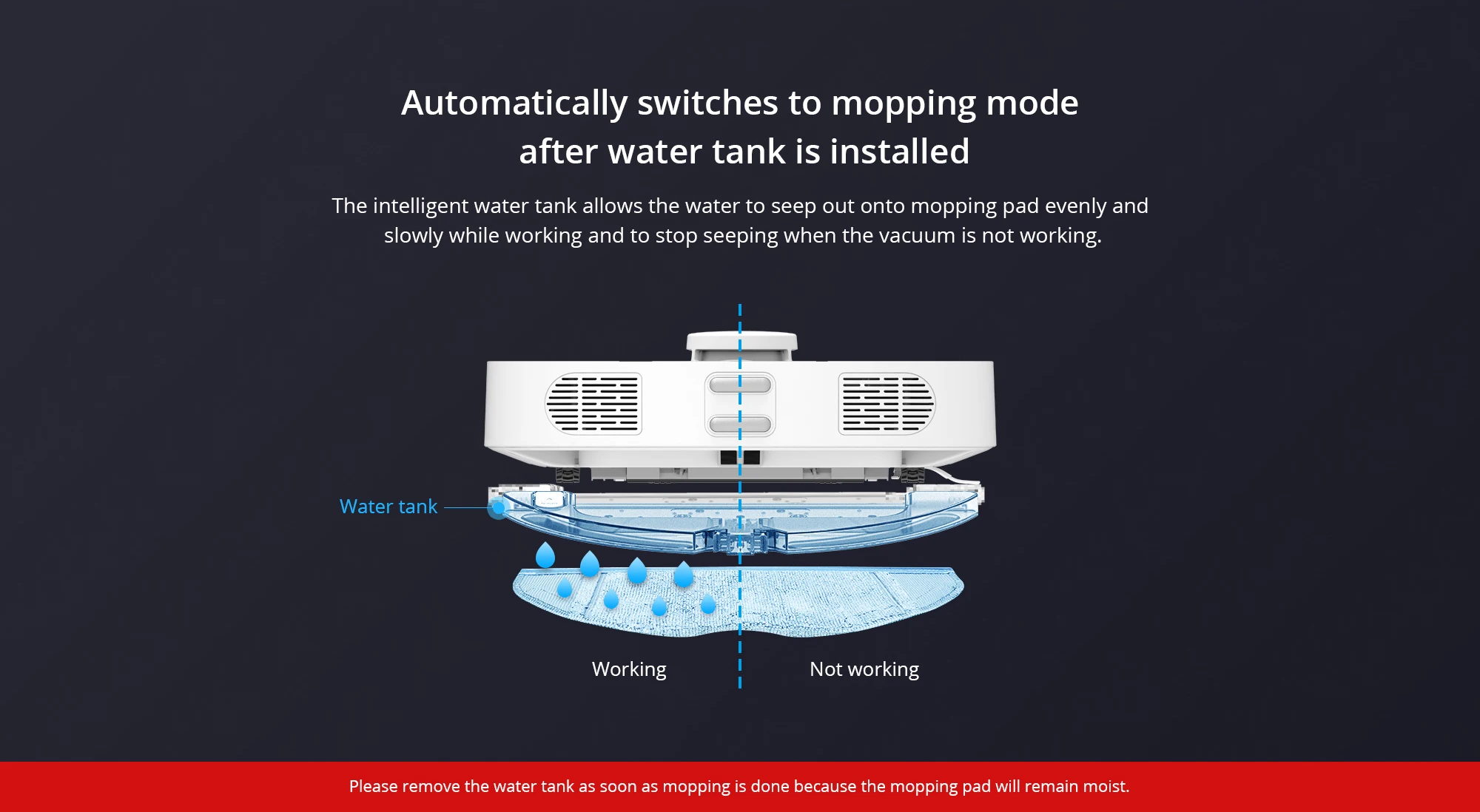 Notes: Please remove the water tank as soon as mopping is done because the mopping pad will remain moist.