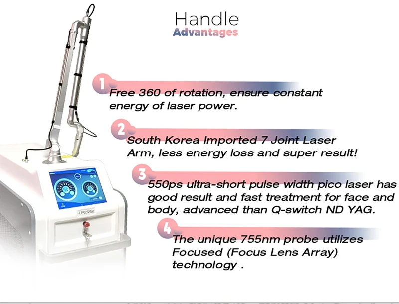 Лазер пикосекунды использует очень короткие импульсный режим вывода, вместо того, чтобы тепловое воздействие на основе принципа светильник механические ударно-волновой, пигмент "разрушенной" в мелко гранулированный через сосредоточенной энергии, чаще всего поглощается метаболизмом организма. Пикосекундный лазер будет минимизировать побочные эффекты теплового эффекта, может достичь цели почти решить все виды пигментных пятен, лучше, чем традиционный эффект лазерного отбеливания пятен.