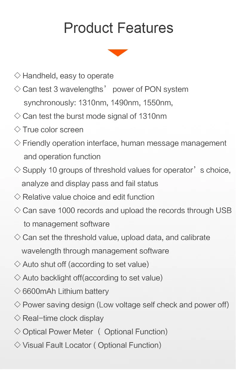 TM70B PON измеритель мощности (pon test instrument) специально разработан для строительства и обслуживания сети PON, которые могут быть соединены между OLT и ONT. Голос, данные, видеосигнал (1310/1490/1550) онлайн можно измерить синхронно и оптическое значение мощности (1310/1490/1550) может быть отображено с помощью этого счетчика. Это полезный инструмент для тестирования площадки для инженеров PON network и операторов обслуживания.