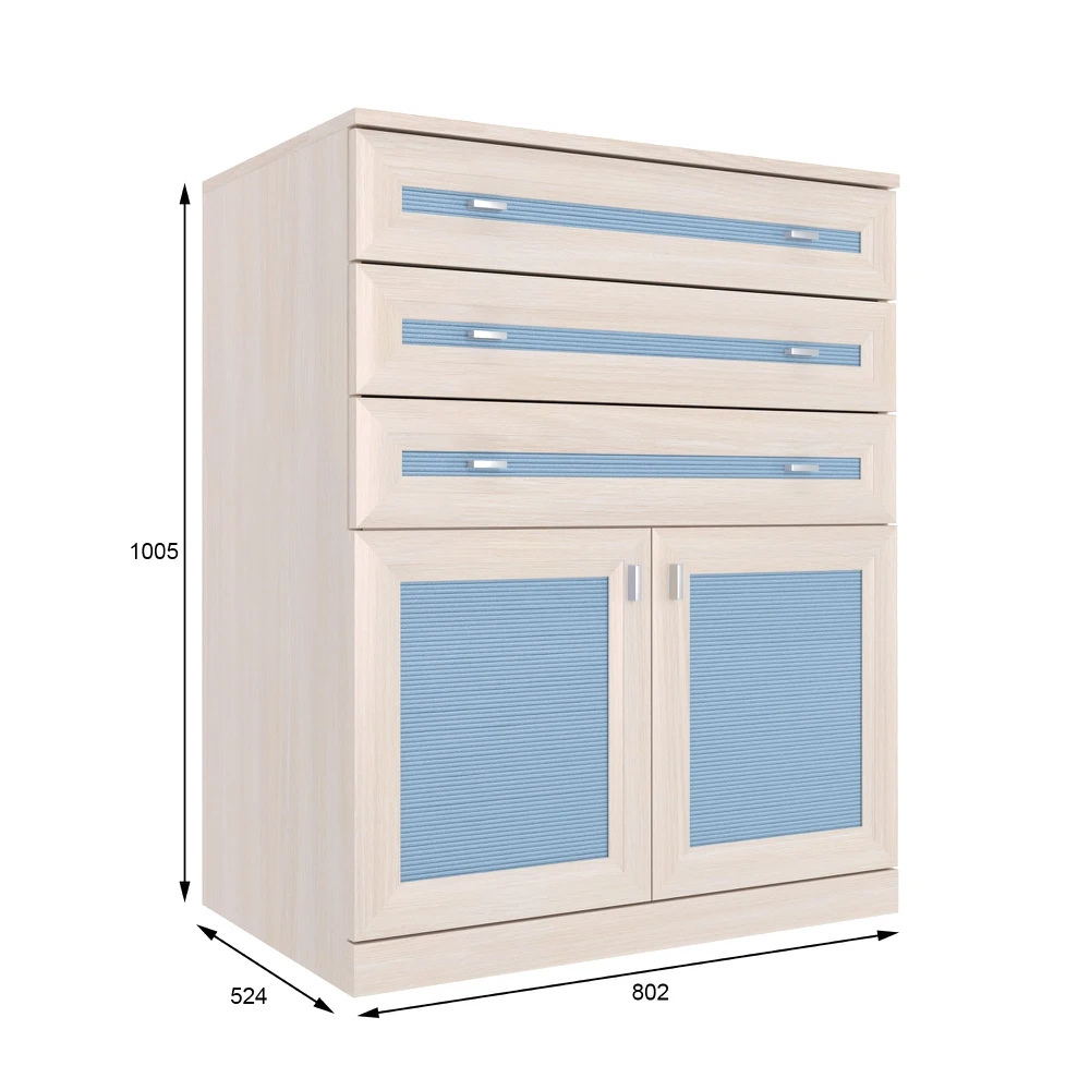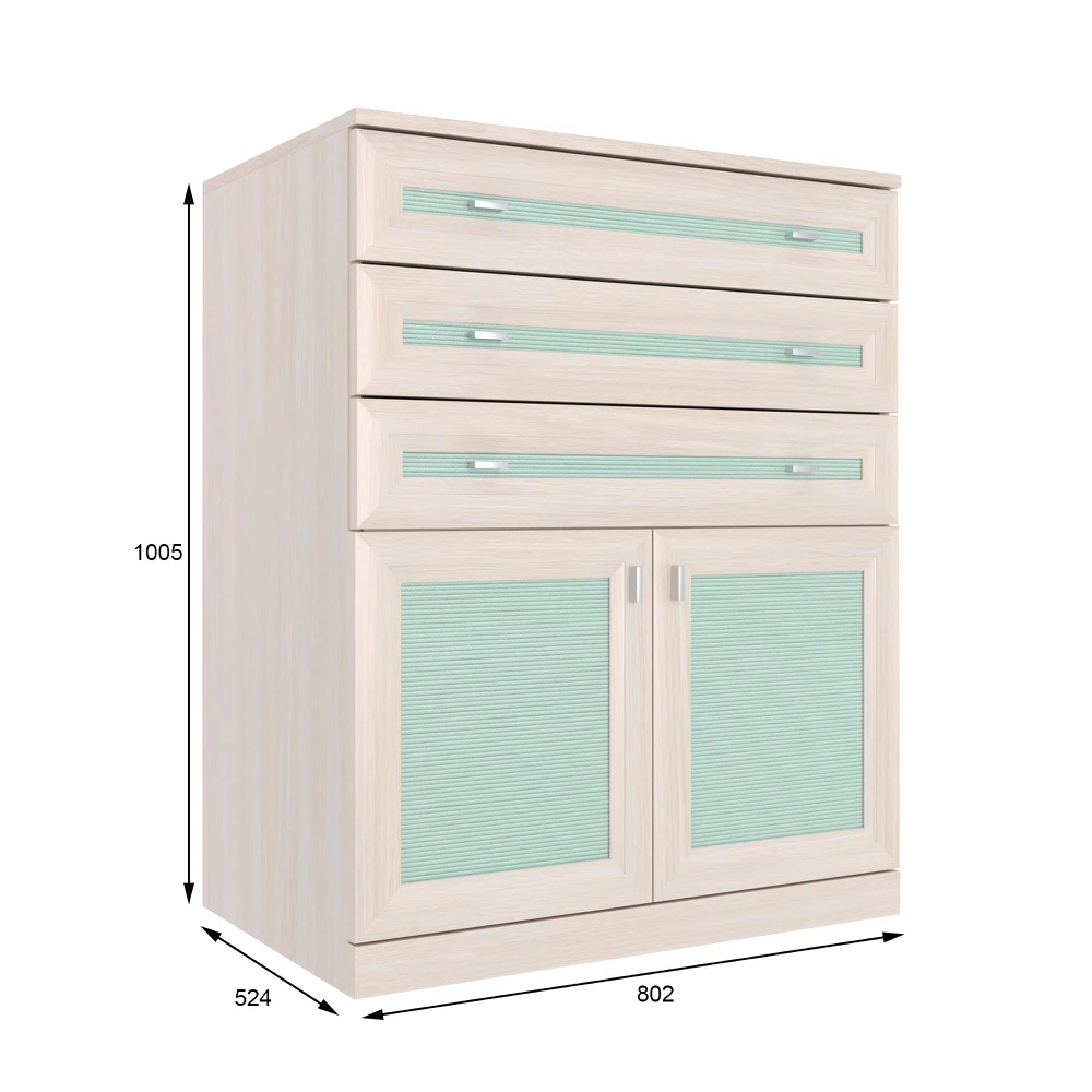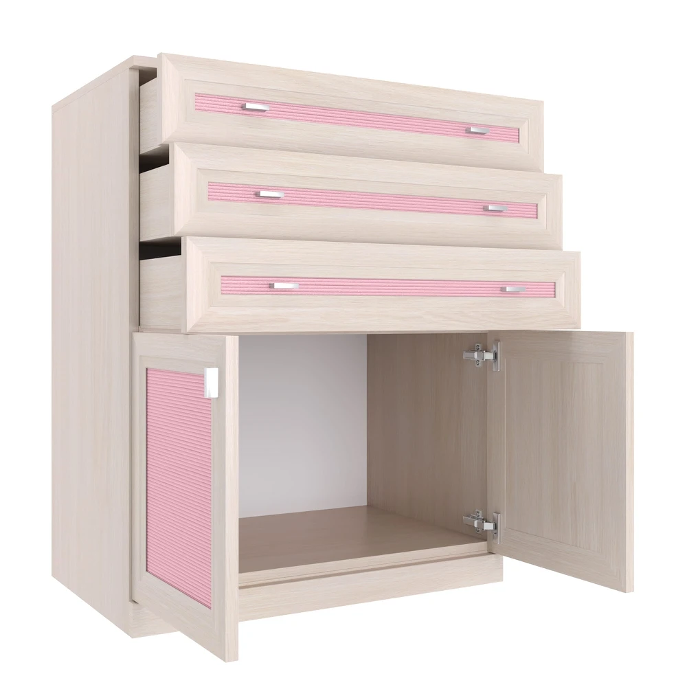 Для более удобного и эргономичного использования комода рекомендуется установить фурнитуру бесшумного закрывания арт. Ф0052, в комплект которой входят петли с доводчиками. В стандартную комплектацию модуля входят петли без доводчиков.