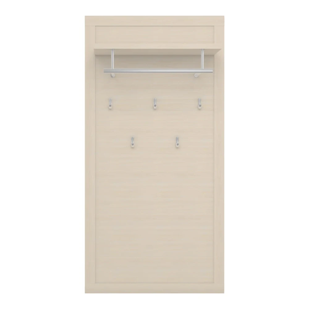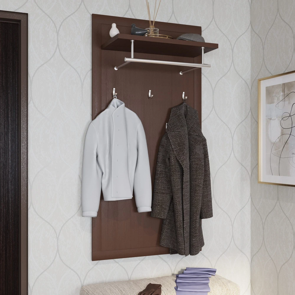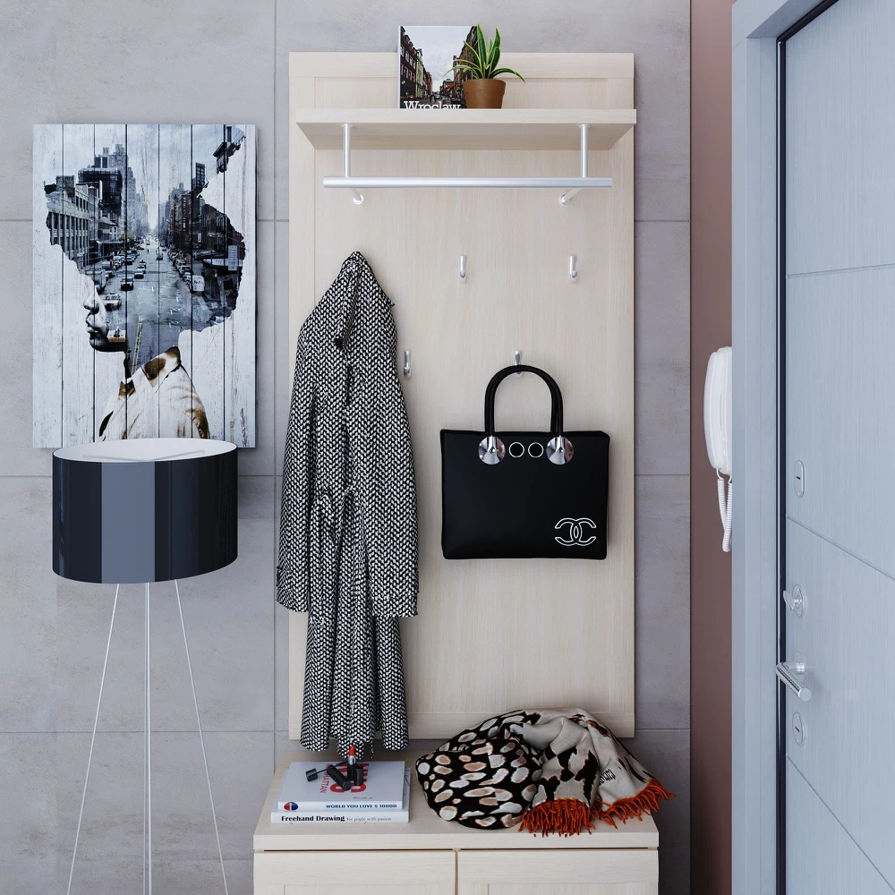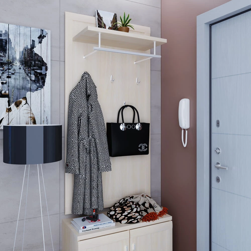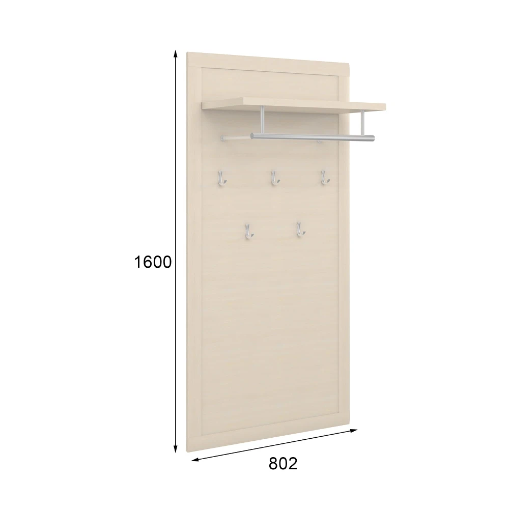 На полотно вешалки устанавливаются пять однорожковых крючков. Сверху модели располагается полка для головных уборов и шарфов, а также стальная штанга для одежды на плечиках.
