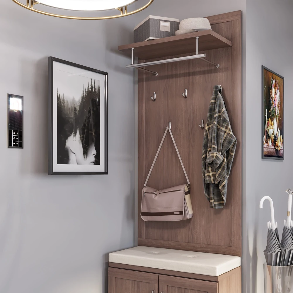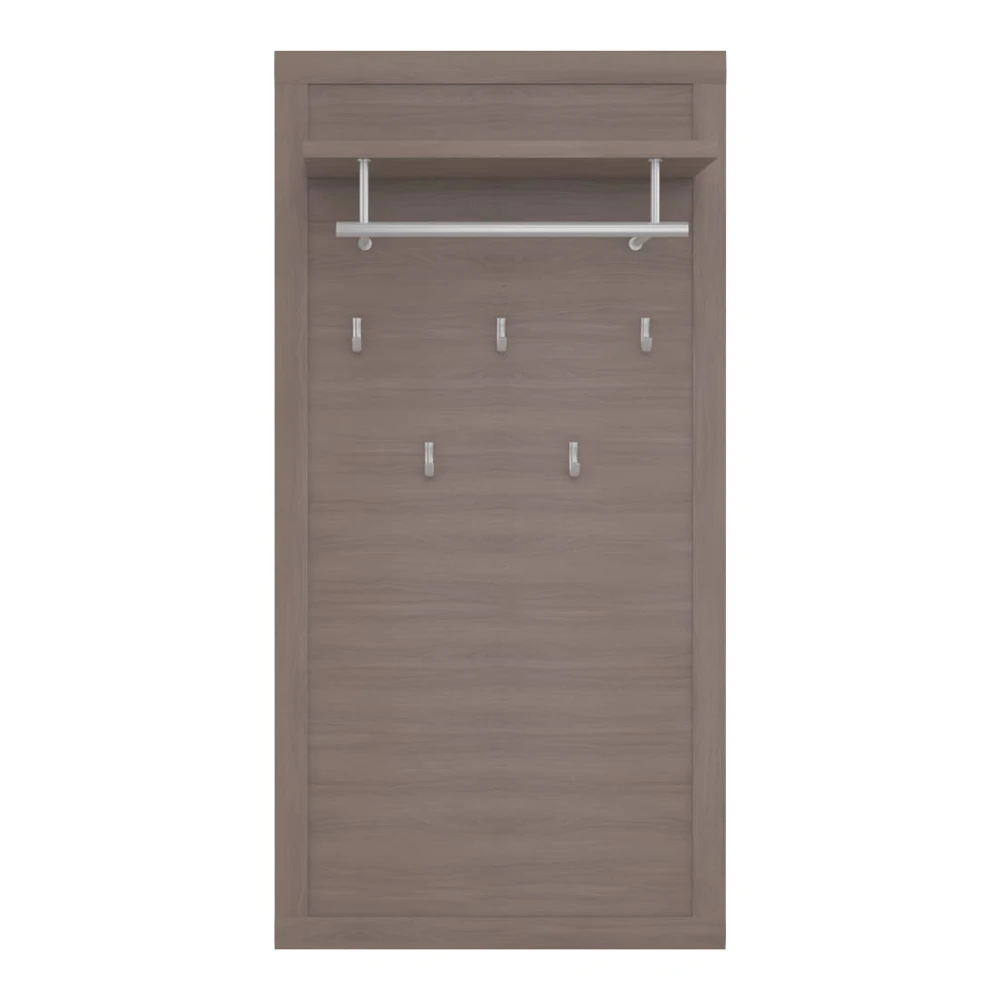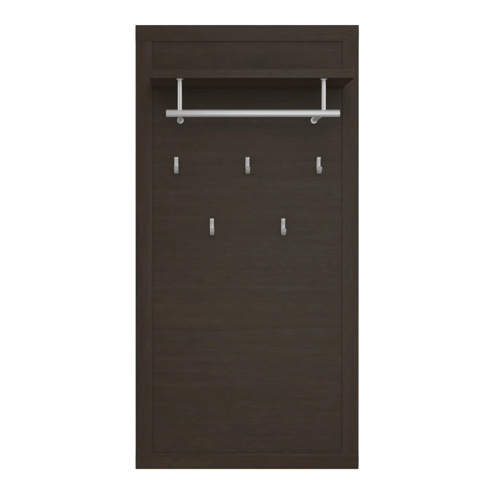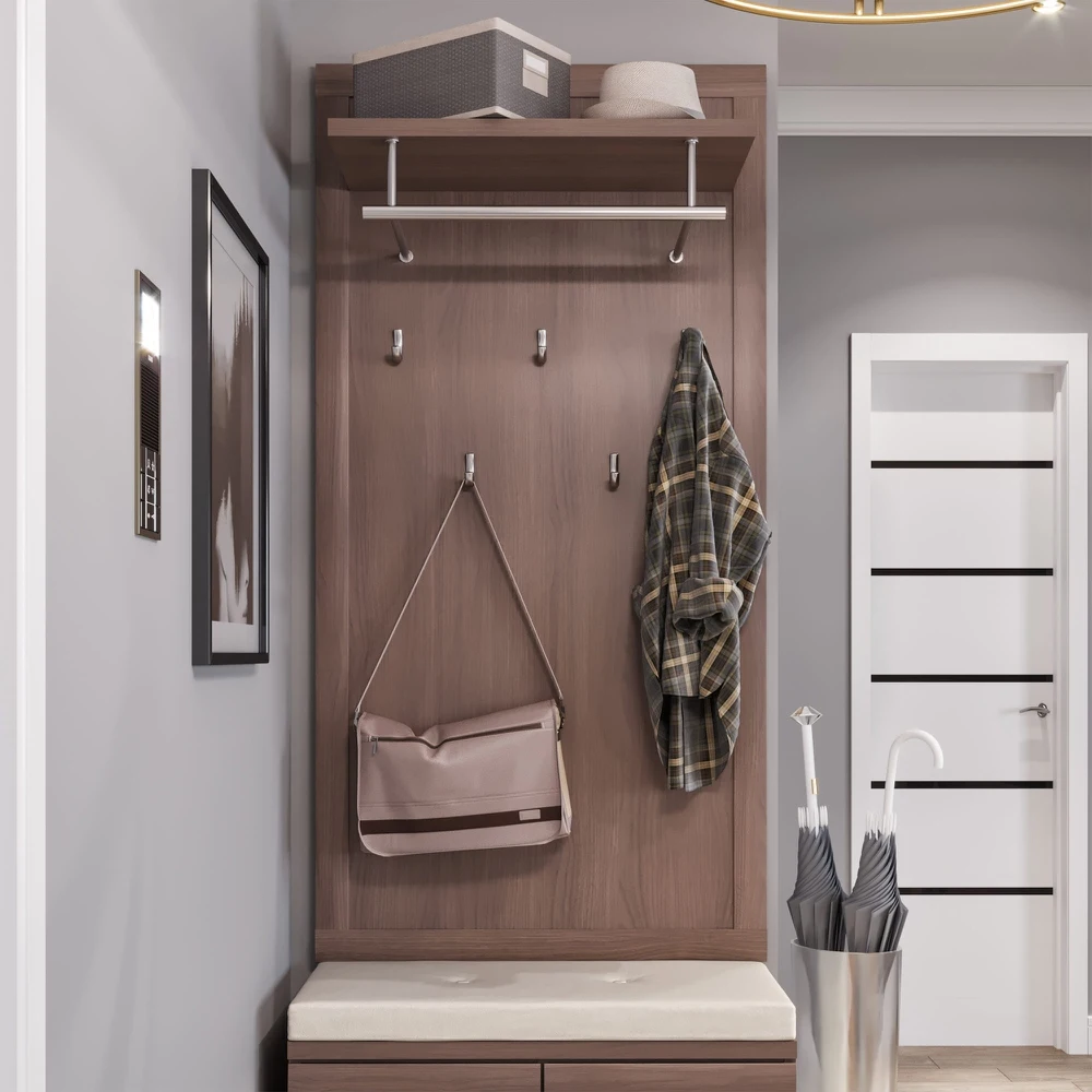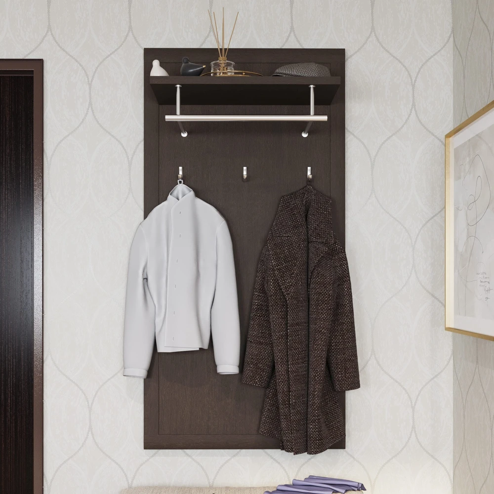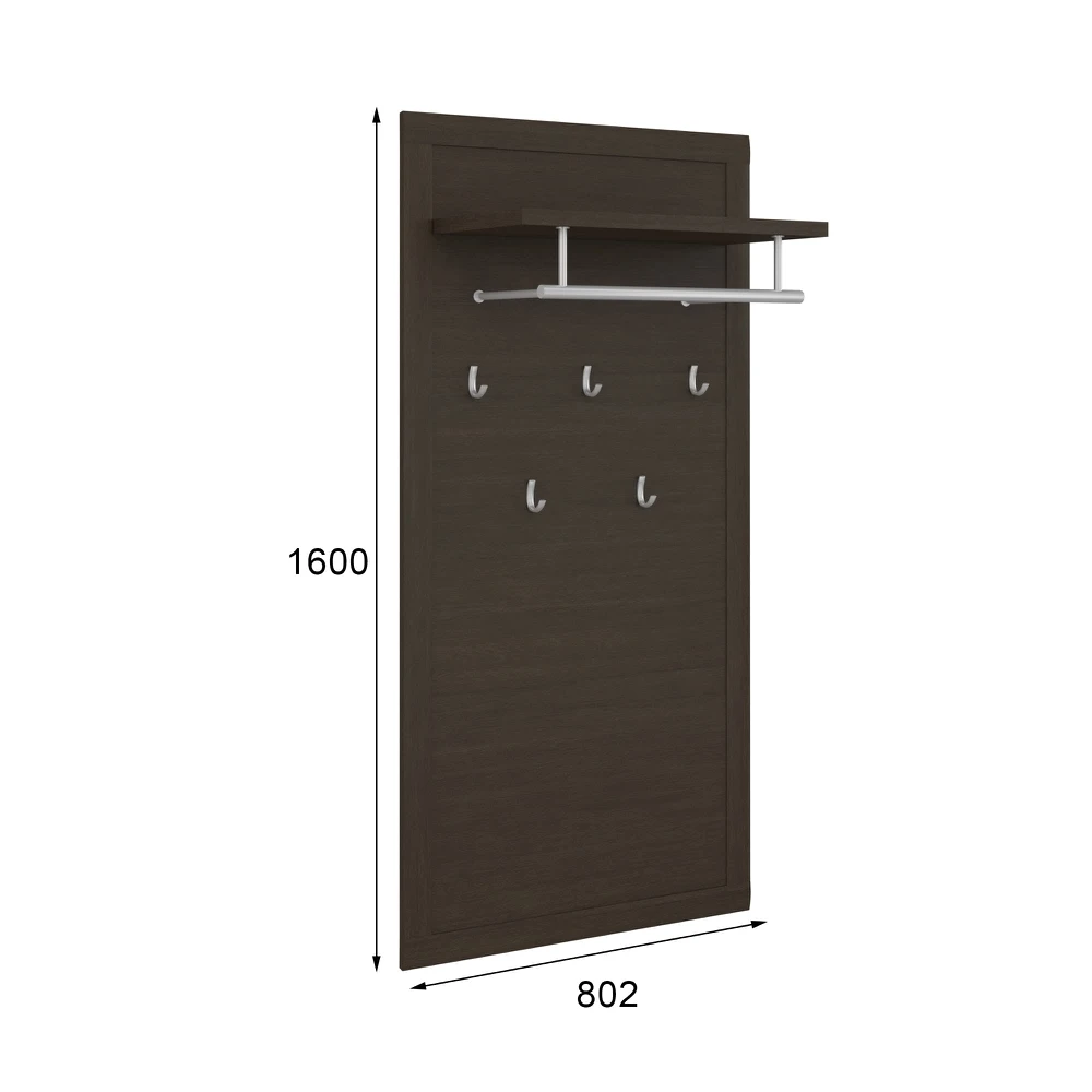 На полотно вешалки устанавливаются пять однорожковых крючков. Сверху модели располагается полка для головных уборов и шарфов, а также стальная штанга для одежды на плечиках.