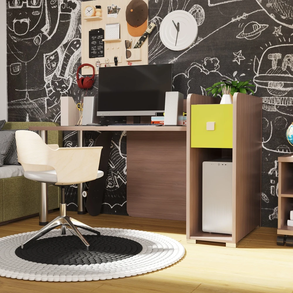 Просторная столешница с отверстием для проводов. Широкая столешница позволяет установить компьютер и разложить необходимые для учебы и творчества материалы. В крышке стола предусмотрено отверстие для удобного вывода проводов.