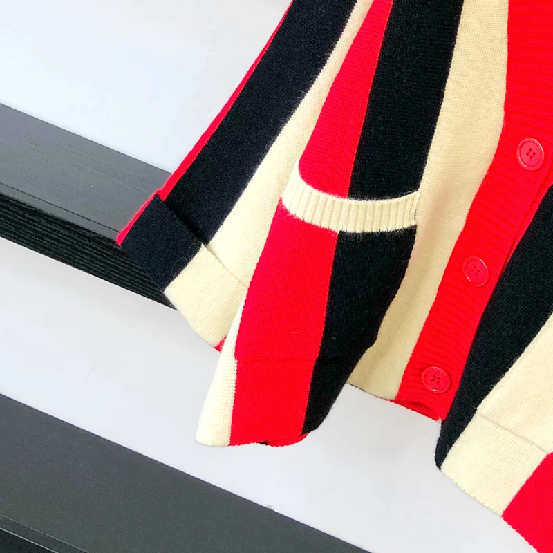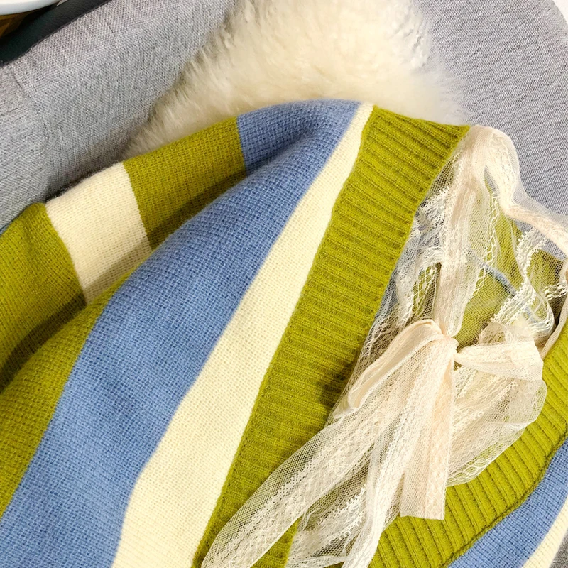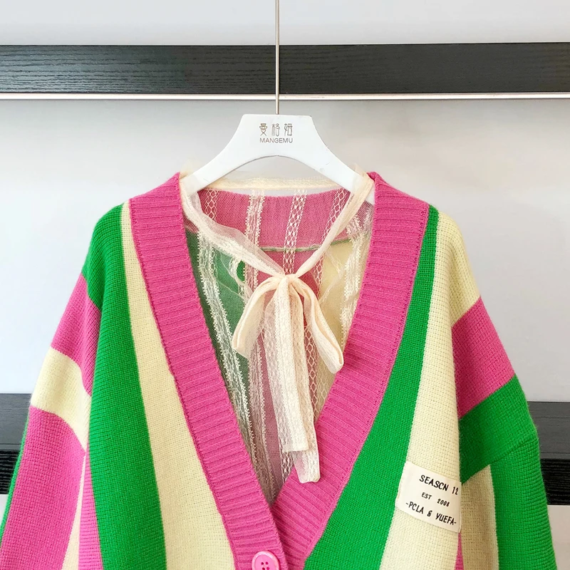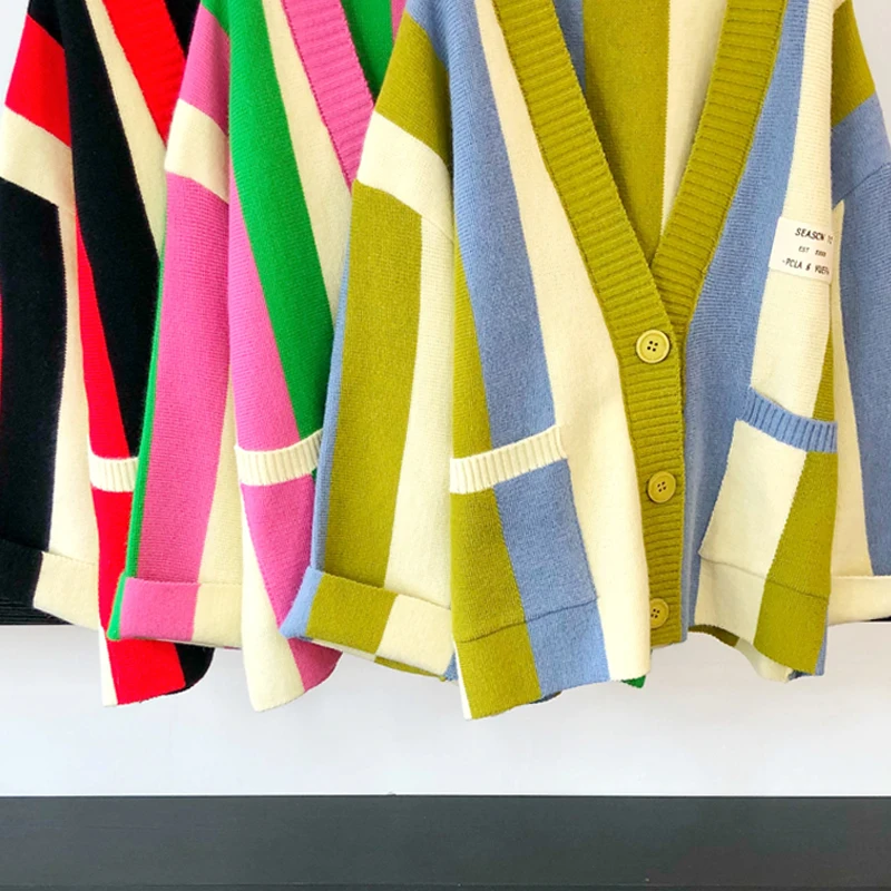 Осенний Повседневный Свободный Вязаный Кардиган большого размера, разноцветный полосатый элегантный стиль, вязаная куртка, свитер, пальто