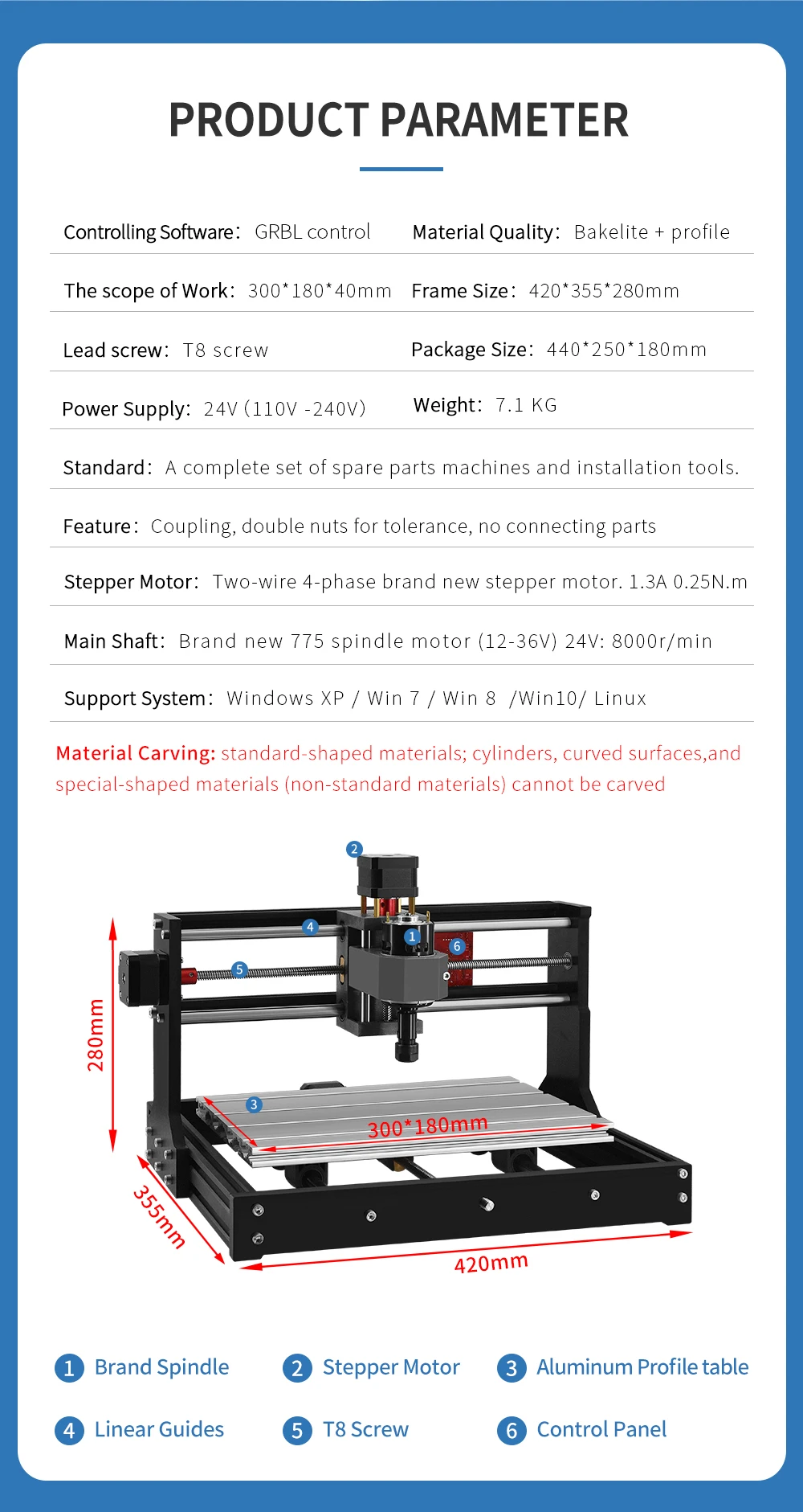 Перед размещением заказа обязательно просмотрите!Пожалуйста, обратите внимание на покупателей: европейские склады не могут быть отправлены в районы, почтовый индекс которых начинается с 38/39.Пожалуйста, выберите Китайский склад для доставки. (Некоторые области являются отдаленными районами, и необходимо оплатить дополнительные дистанционные сборы)Это причина для логистического канала, который не находится под нашим контролем.Приносим извинения за причиненные вам неудобства, спасибо! Этот гравировальный станок с ЧПУ специально разработан для развлечения, учебы и исследований DIY, что дает вам Экстремальный портативный опыт. Этот гравировальный станок с ЧПУ имеет функцию гравировки, резьбы и фрезерования. Этот резной станок может быть выгравирован пластиком, деревом, акрилом, ПВХ, печатной платой, деревом или подобным материалом. Сверло не может выгравировать твердый металл, нефрит или другие твердые материалы. Особенности:Этот гравировальный станок DIY с ЧПУ специально разработан для развлечения, учебы и исследований DIY с профессиональным программным обеспечением GRBL, что дает вам Экстремальный портативный опыт.Изготовлен из алюминия и с окислительной обработкой, цельнометаллический фюзеляж прочный и красивый.Если вы опытный любитель гравировки с ЧПУ, который ищет обновление, вы можете добавить комплект лазерного модуля к машине. С помощью этого модуля, он может дать вам различные способы раскрыть ваше творчество. Характеристики:Модель: 3018ProВилка: США + ЕСПрограммное обеспечение управления: GRBLМатериал: алюминий + пластикЦвет: серебристый + черныйРабочая зона: 300*180x40 мм/11,8*7,1*1,6 дюймовРазмер оправы: 420*355*280 мм/16,5*14*11 дюймовШпиндель: 775 мотор шпинделя (12-36 в) 24 В: 8000р/минПатрон шпинделя: ER11Шаговый двигатель: 1.5A / 0.42N.mИсточник питания: 24 В/5,6 А (110 В-240 В)Поддерживаемая система: Windows XP / Win 7 / Win 8 / Win 10 /LinuxГравировальные материалы: пластик, дерево, акрил, ПВХ, печатная плата и другие мягкие материалы.Порт связи: Micro USBСвинцовый винт: T8Упаковка: коробкаПосылка Размеры: 7,1 кг/250ozПосылка Вес: 44*25*18 см/17,3*9,8 * 7inПримечания:1. Эта машина не собирается. Вы получите все детали в посылка, и вам нужно собрать его самостоятельно.2. При работе гравировального станка, пожалуйста, не кладите какую-либо часть вашего тела на машину, чтобы избежать травм вашего тела. Использование метода:1. Подключите источник питания и Подключите USB.2. Установите драйвер.3. Чтобы определить com-порт вашей машины.4. Откройте программное обеспечение grblControl. Список посылка:(DIY Kit, нужно собрать самостоятельно.)1 * полный набор деталей и инструментов для установки (без лазера ![]()