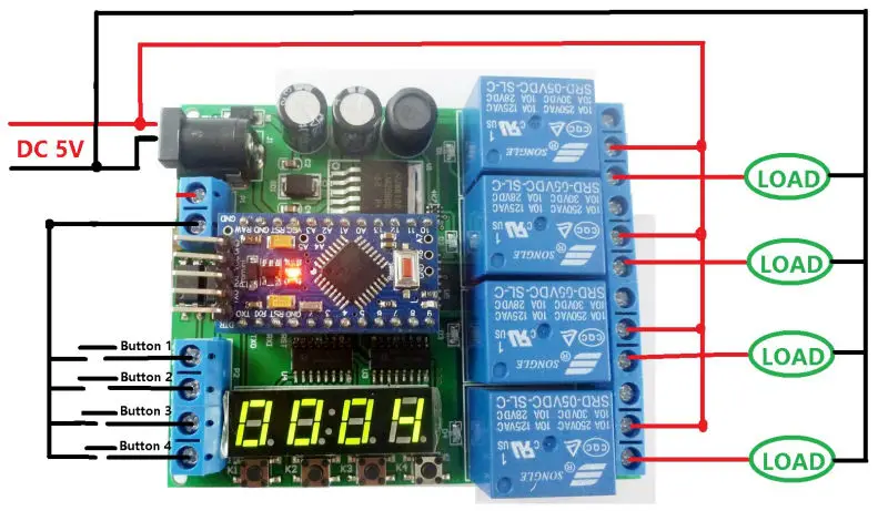 2 DC 5V control circuit,Wiring diagram below. ''LOAD'' may be LED lights,fans, Development board and other DC 5V equipment