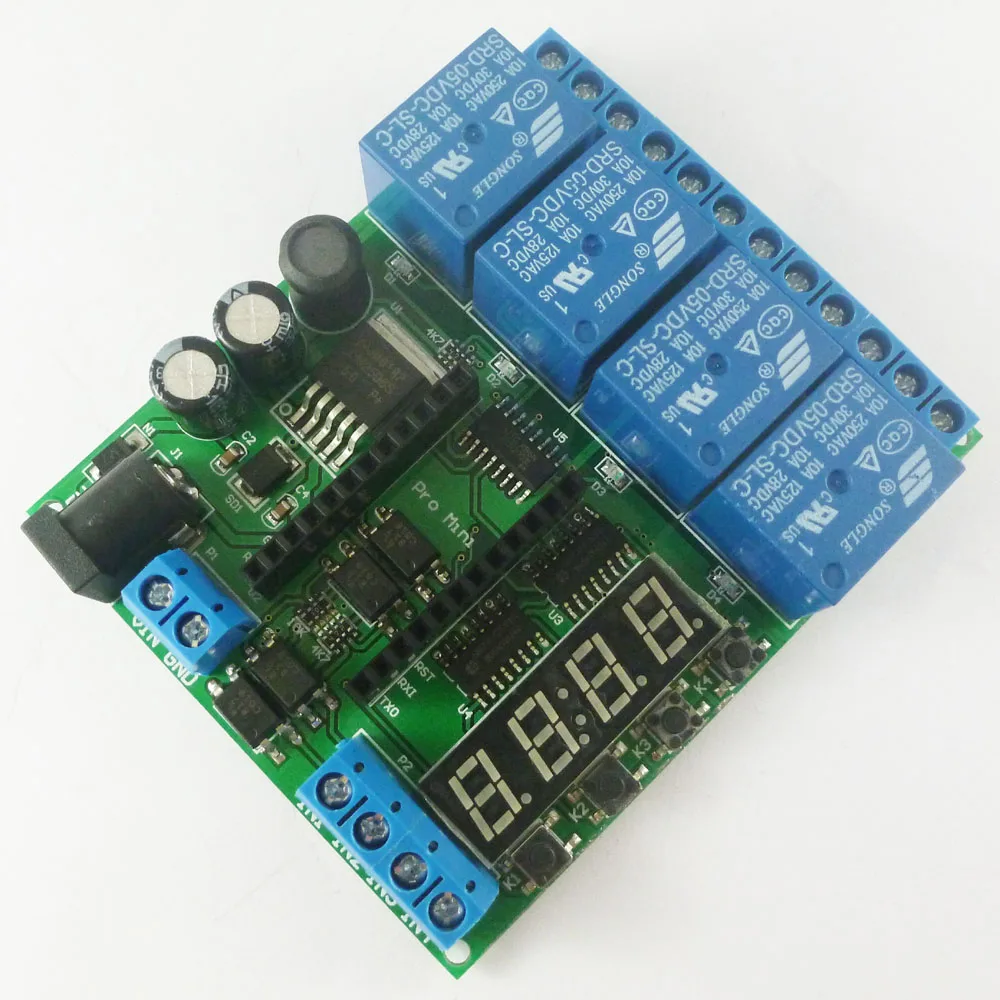 Product Name: DC 5V 12V 24V 4 Channel Pro mini PLC Board Relay Shield Module for Arduiuo Delay Timer Switch Package inlcuded: 1 PCS DC 5V-24V 4 channel Pro mini PLC relay board(Does not include Pro mini Board)