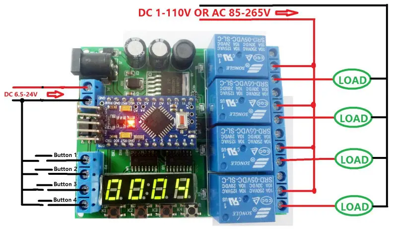 Product Features: 1 Operating voltage: power supply 1,DC 6.5-25V; power supply 2,DC 5V 2 Operating Current: Standby current (all relays closed) 15MA, 1 relay open 45MA, 2 relays open 77MA, 3 relays open 109MA, 4 relays open 140MA 3 on-board resources: 4x opto-isolated inputs (low level trigger, NPN type), 4x buttons, 1x 4 bit digital tube display, 1 pair of Pro mini slots, 4x relay outputs 4 size 80*66*19mm 5 Weight : 79g We provide the code(sketch) can only achieve a simple delay function,The delay time is adjusted by modifying the delay parameter of the code(sketch). If you need more functionality, write your own code. We do not provide additional code(sketch) and technical support How to use: See video '' IO22C04 pro mini delay relay demo''(You can search for videos on GOOGLE) Note: IO22C04 can not work independently, must be under the control of the Pro mini board to work,If you do not have a Pro mini board, purchase it separately or purchase a kit with Pro mini You may need: Pro mini Board, click here ! Pro mini Downloader, click here! Application examples : As long as you write ARDUIUO Pro mini code(sketch),You can use it to achieve a variety of delay timer function,such as: Motor forward and reverse, Timing on, Timing off, Power-up delay, Trigger delay, Infinite loop delay, A finite number of cyclic delays, Power sequencer, And so on. Wiring diagram : 1 DC 6-24V control circuit,Wiring diagram below. ''LOAD'' may be LED lights, fans, motors and other DC 6-24V equipment
