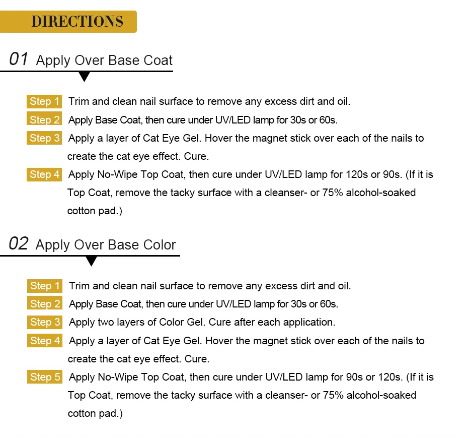 Шаг 5.Нанесите второй слой цветного лака, не излечивайте и не кладите магнит на ногти в течение 10 секунд, чтобы получить эффект кошачьих глаз, А затем немедленно вылечите УФ-лампой в течение 60 секунд или вылечите светодиодный светильник в течение 30 секунд;