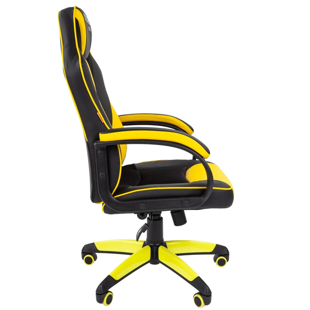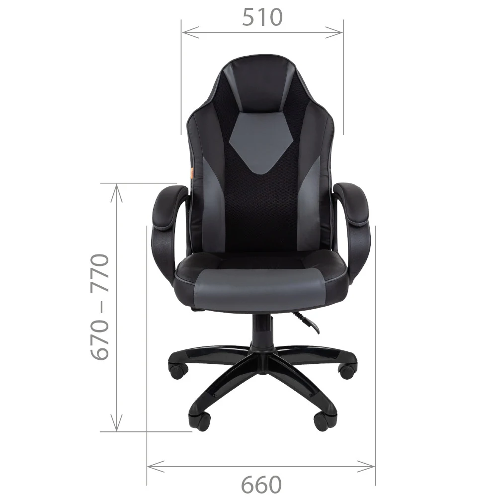 Gamer chair made of eco-leather. Armrests with decorative plastic elements and soft pads. The mechanism of swing the backrest with fixation in the working position. Height adjustment. Gas cartridge 3 class. Load up to 120 kg.