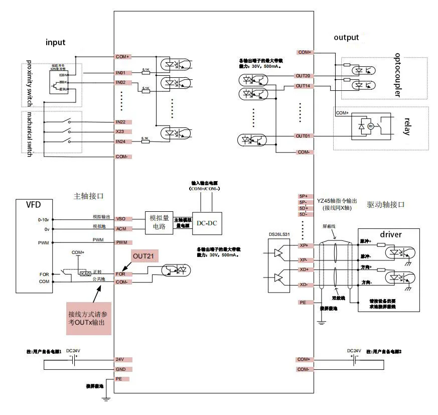 Импульсное направление принимает дифференциальный выход, максимальная интерполяция импульсной выходной частоты-1 МГц; Непрерывный режим управления шпинделем: многоступенчатая скорость (4 шага и 16 скоростей), аналог (0-10 В), серво шпиндель;