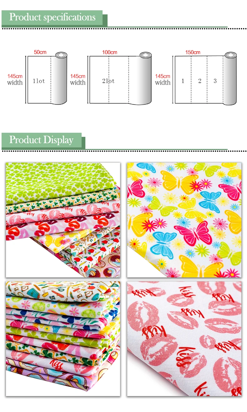 Материал: набивная ткань Цвет: как на картинке Размер: 50 см x 145 см/Предмет: 1 мм Вес: 100 г/шт Использование: домашнее украшение, обувь, сумки, пэчворк, стеганое шитье, подушки, подушки и любые изделия из ткани.