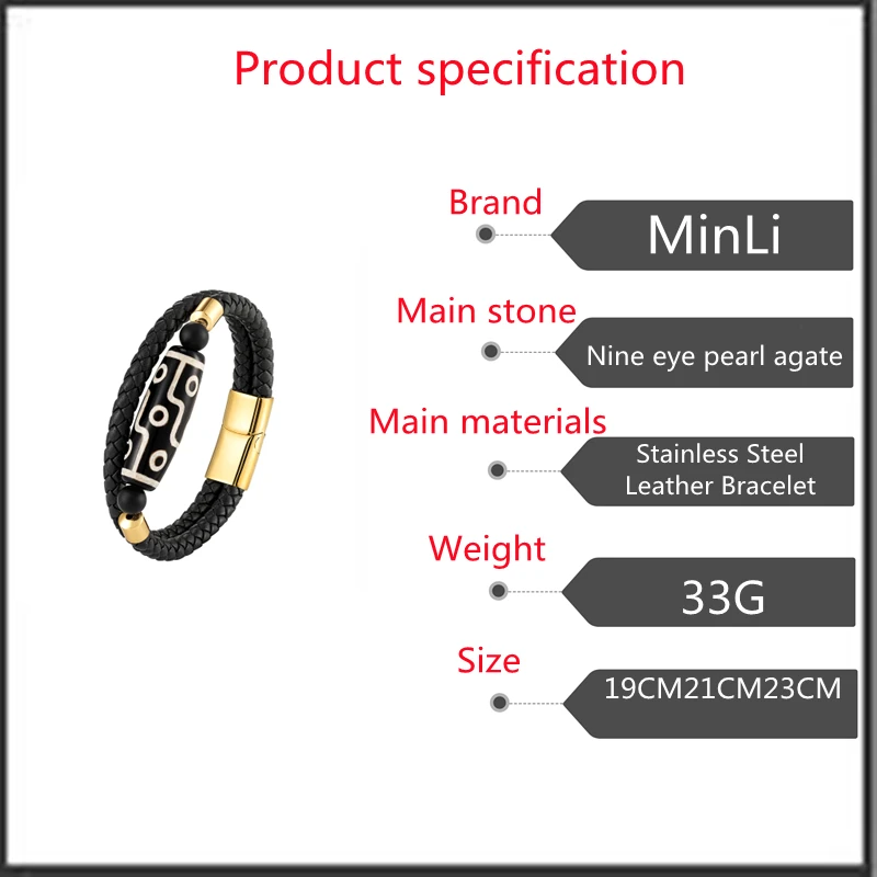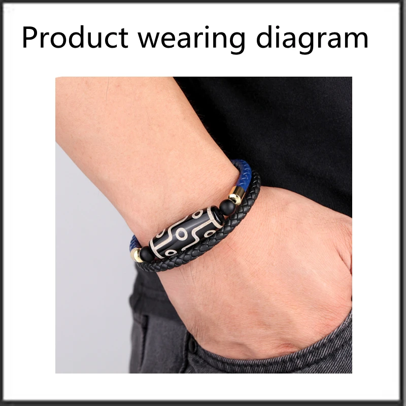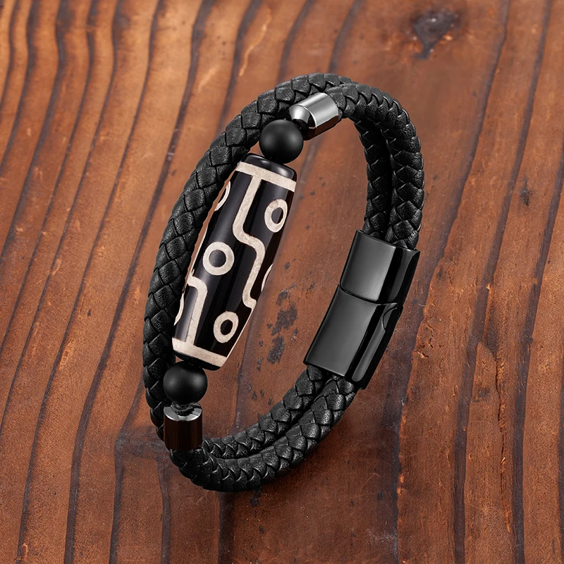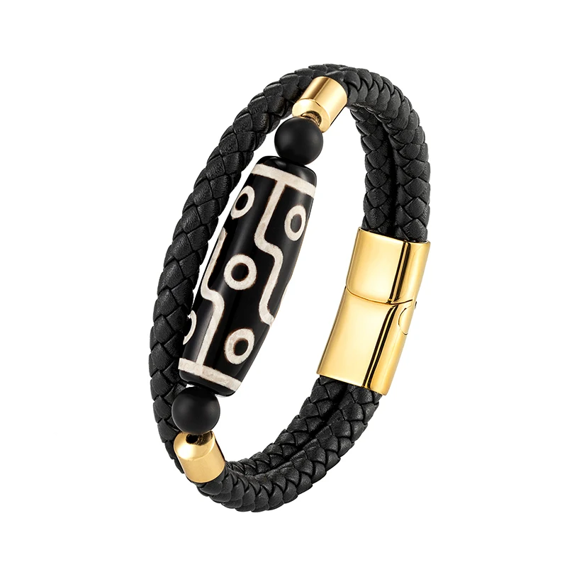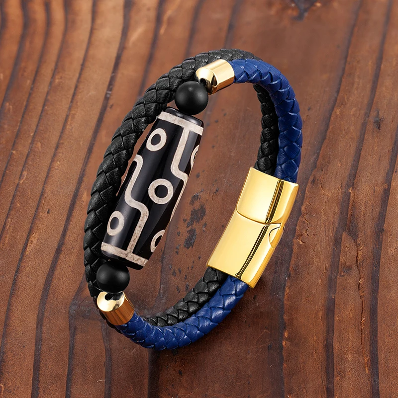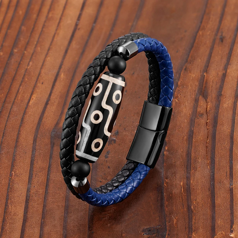 Продолговатый 9-eye dzi натуральный агат ювелирные изделия двухцветный этнический стиль мужской браслет 316L из нержавеющей стали кожаный браслет