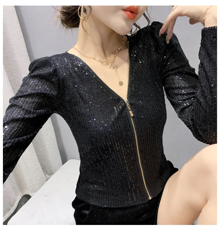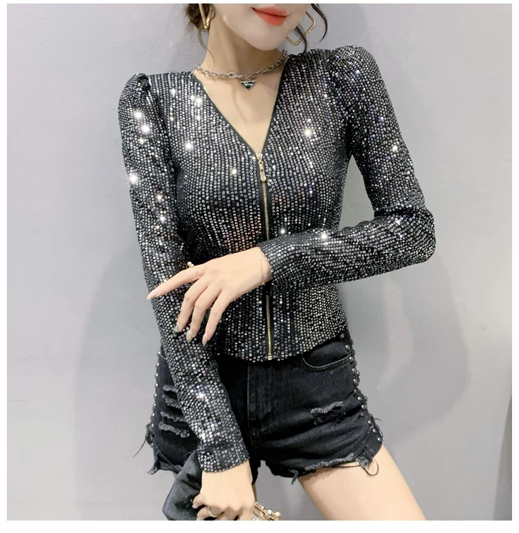MadBlack/осенне-зимняя европейская одежда, Яркое пальто, шикарный сексуальный кардиган на молнии с v-образным вырезом, блестящие Женские топы с длинными рукавами и бусинами C19801A