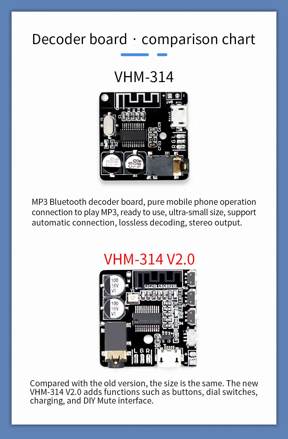 После включения питания синий индикатор загорается и переходит в режим Bluetooth; На английском языке отображается «устройство bluetooth готово к сопряжению», указывает, что режим Bluetooth введен и ожидает сопряжения; «VHM-314» Поиск через мобильный телефон Bluetooth-это имя устройства декодирующей платы. Нажмите на соединение, Плата декодера предлагает «устройство bluetooth Подключено успешно», указав, что Плата декодера и мобильный телефон успешно подключены, вы можете воспроизводить музыку.