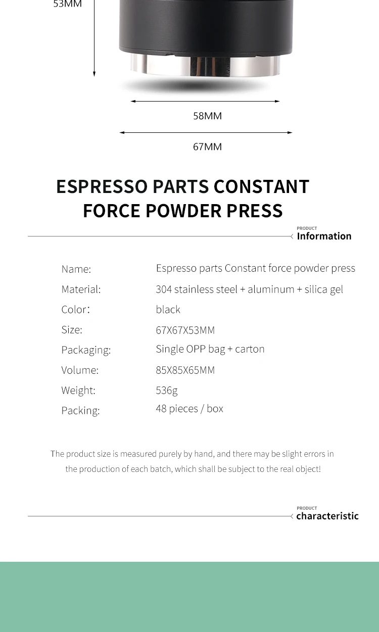 Название:Эспрессо части постоянной силы порошок прессМатериал:304 нержавеющая сталь + алюминий + силикагельЦвет:ЧерныйРазмер:67x67x53ммВес:536 г Размер продукта измеряется исключительно вручную, и при изготовлении каждой партии могут быть небольшие ошибки, которые подлежат реальному предмету!