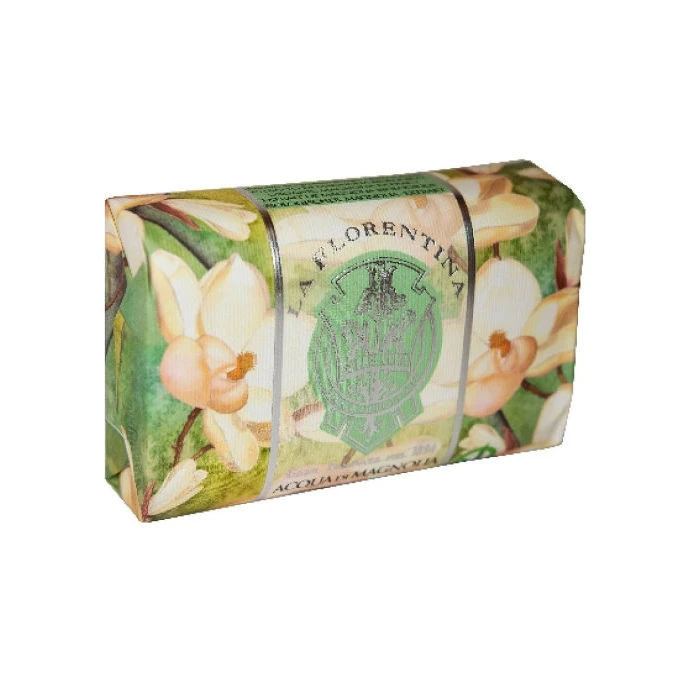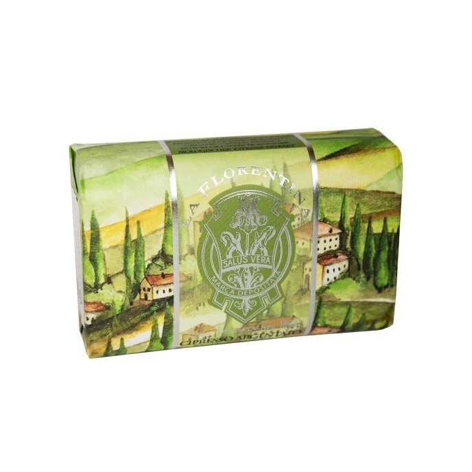 Мыло упакованное в крафтовую бумагу, на которую нанесены орнаменты и пейзажи, созданные итальянскими художниками, вдохновленными тосканской природой.