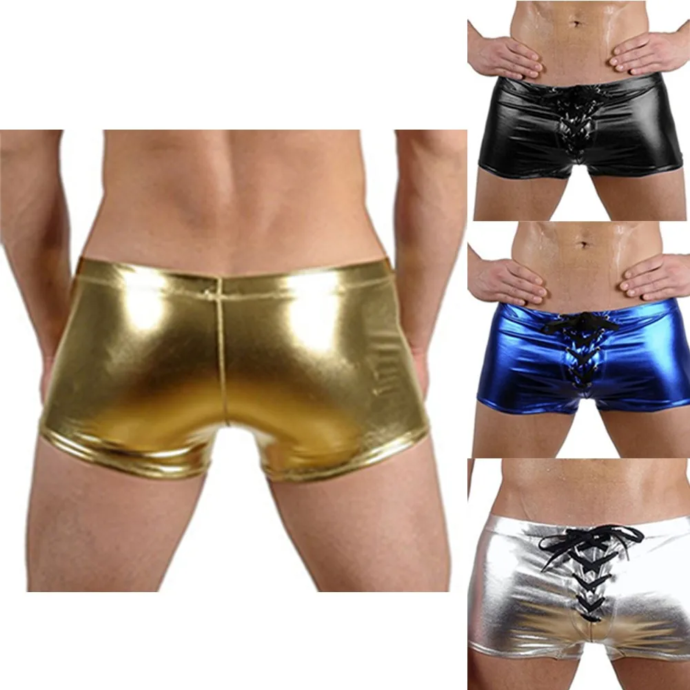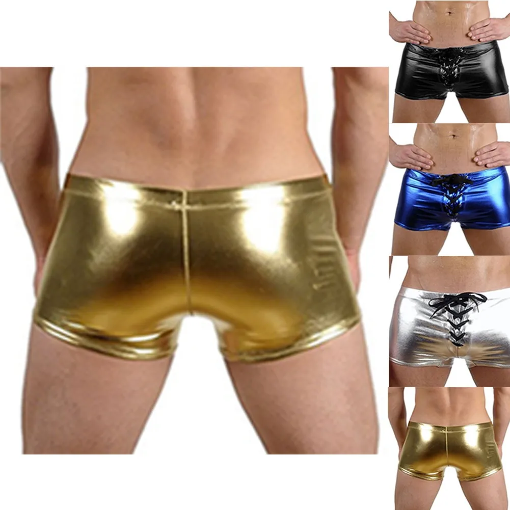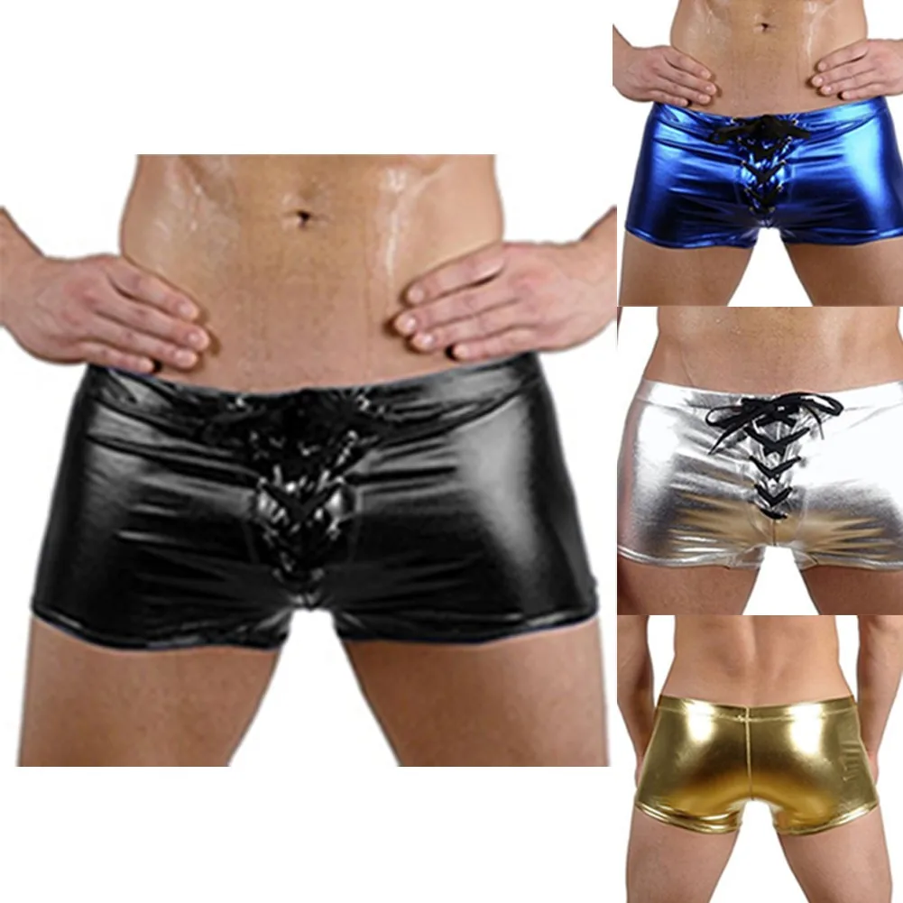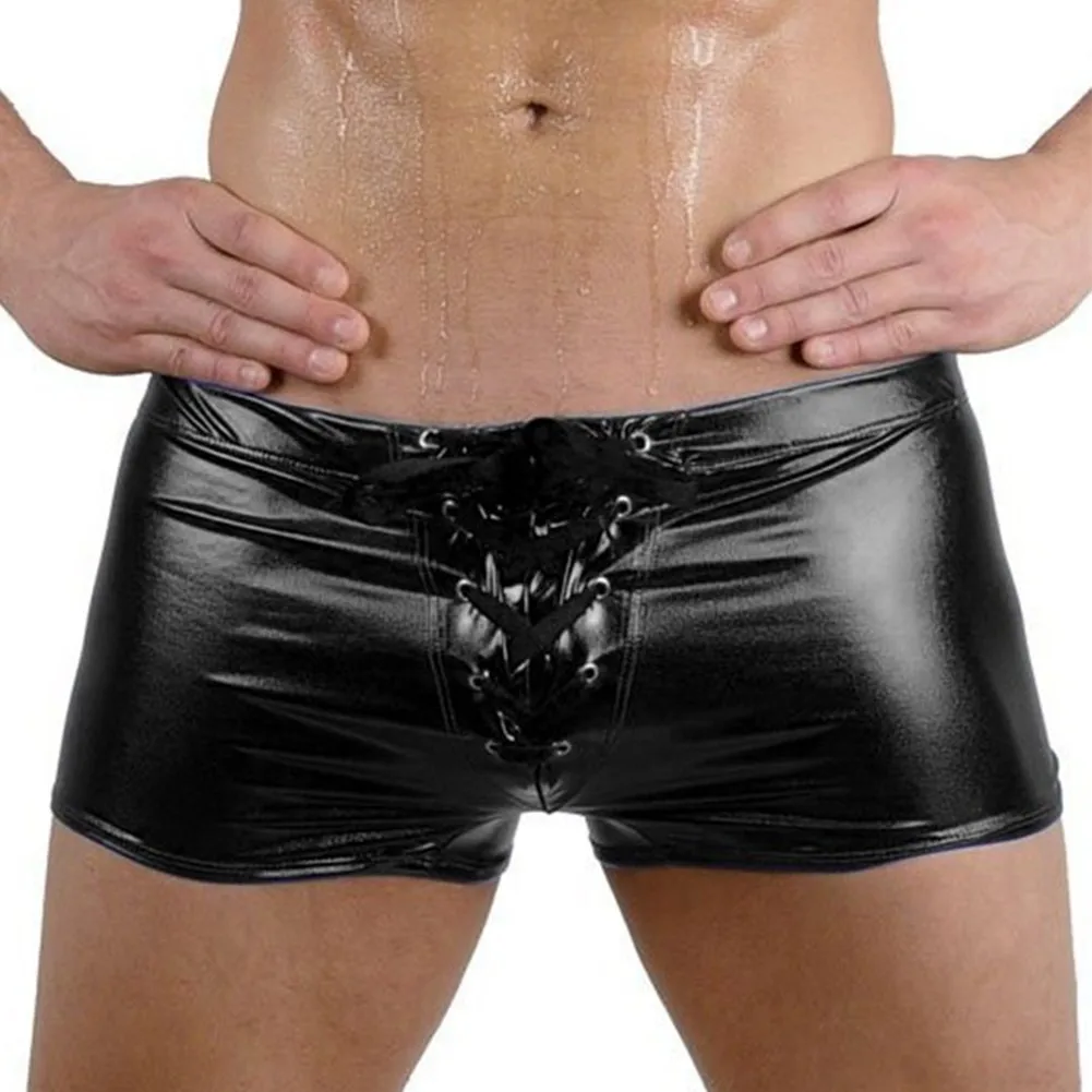 Мужские сексуальные шорты-боксеры, кожаное блестящее нижнее белье, эротическое короткое нижнее белье на молнии, трусы Sissy, горячие трусы, эластичное нижнее белье с поясом