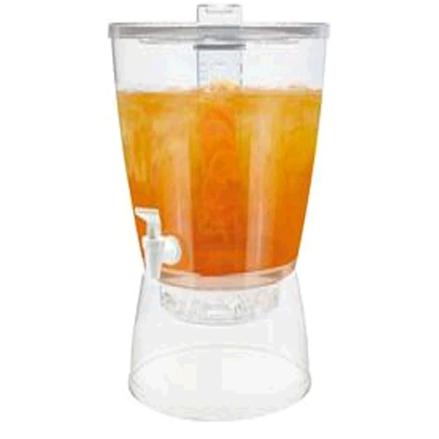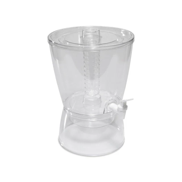 Оснащен краном для удобного дозирования, плотно закрывающейся крышкой с ситечком и подставкой с отделением для льда, которая охлаждает напитки, но предотвращает таяние льда и не разбавляет их.