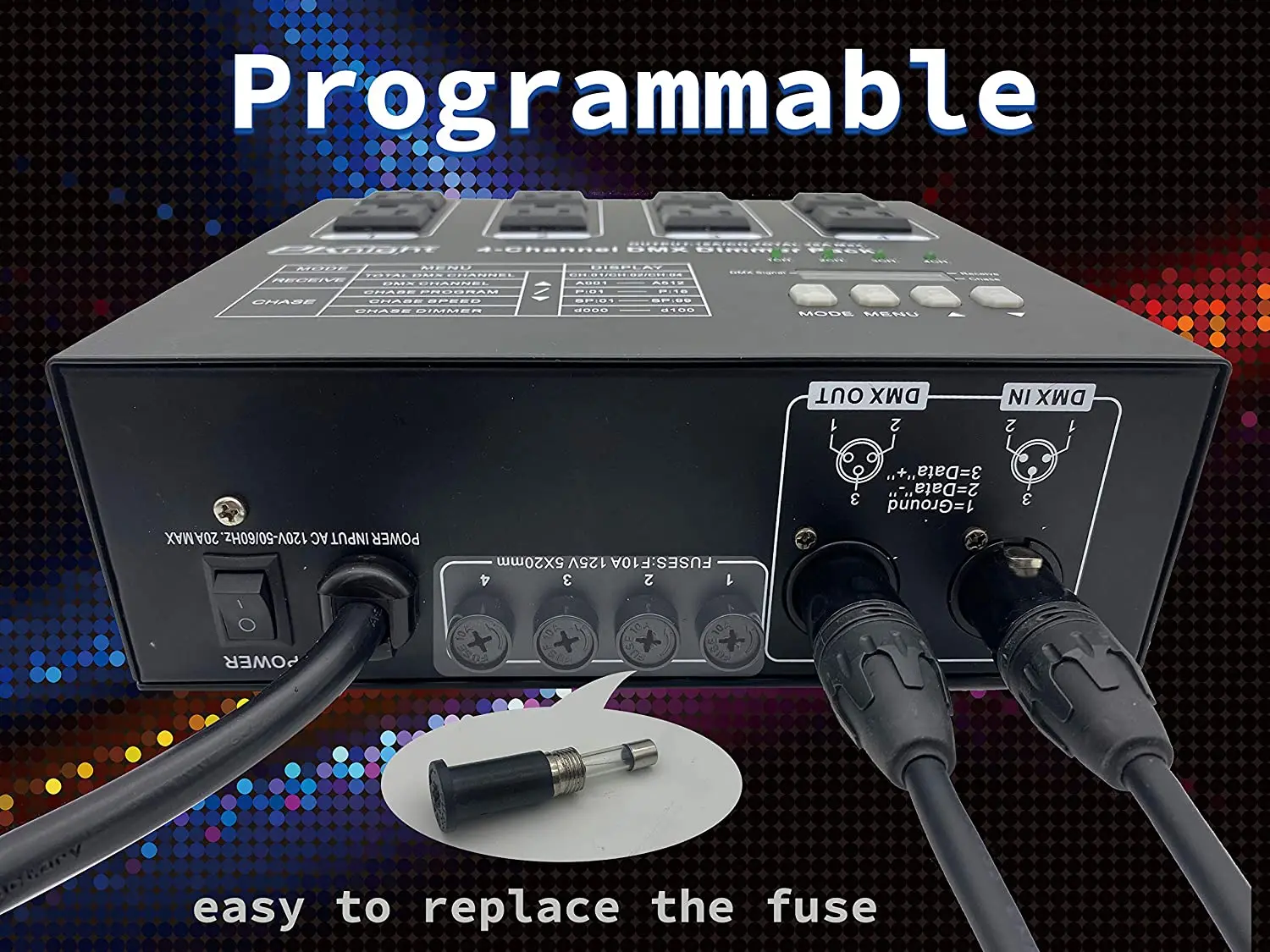 Простота в обслуживании: диммерный блок от Pknight Products оснащен четырьмя внешними канальными предохранителями, которые легко доступны для быстрого обслуживания на ходу.