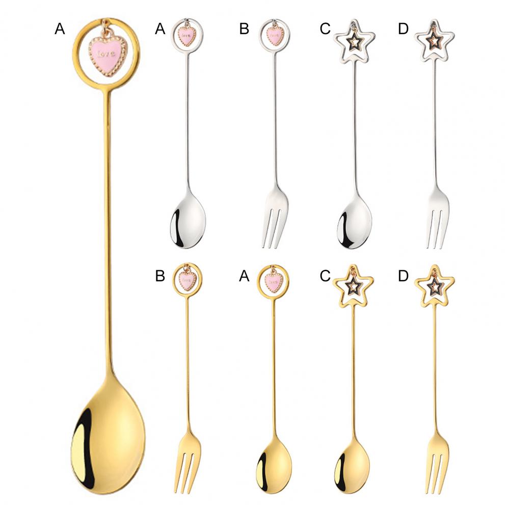 Каждая ложка и вилка поставляется с сердечком или пятиконечной формой звезды на хвосте ручки, чтобы ее можно было использовать в качестве приятного десертного украшения.