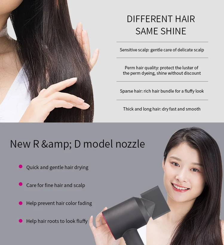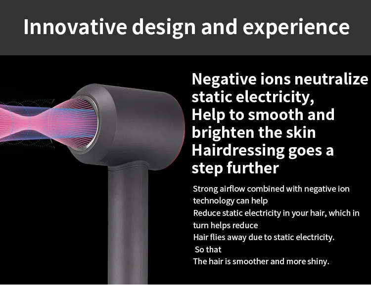 1. Функция отрицательных ионов: Анионный генератор фен для волос производит миллионы отрицательных ионов для защиты кожи головы от тепловых повреждений, гладких волос.